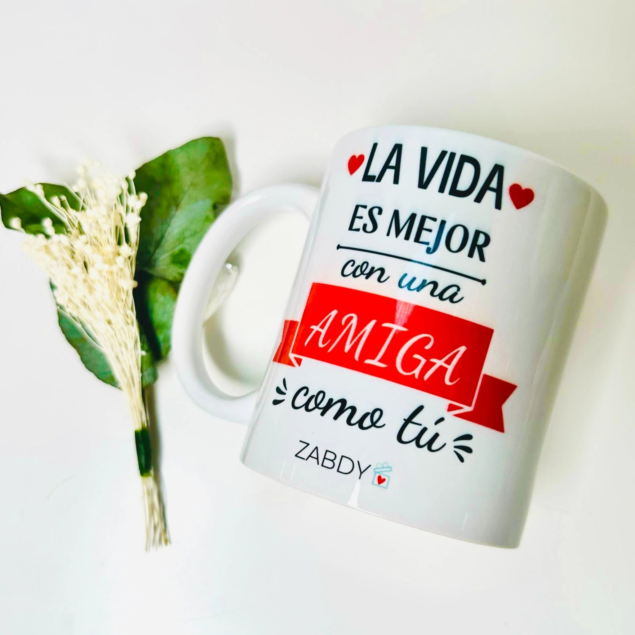 • Taza con mensaje “La vida es mejor con una amiga como tú”