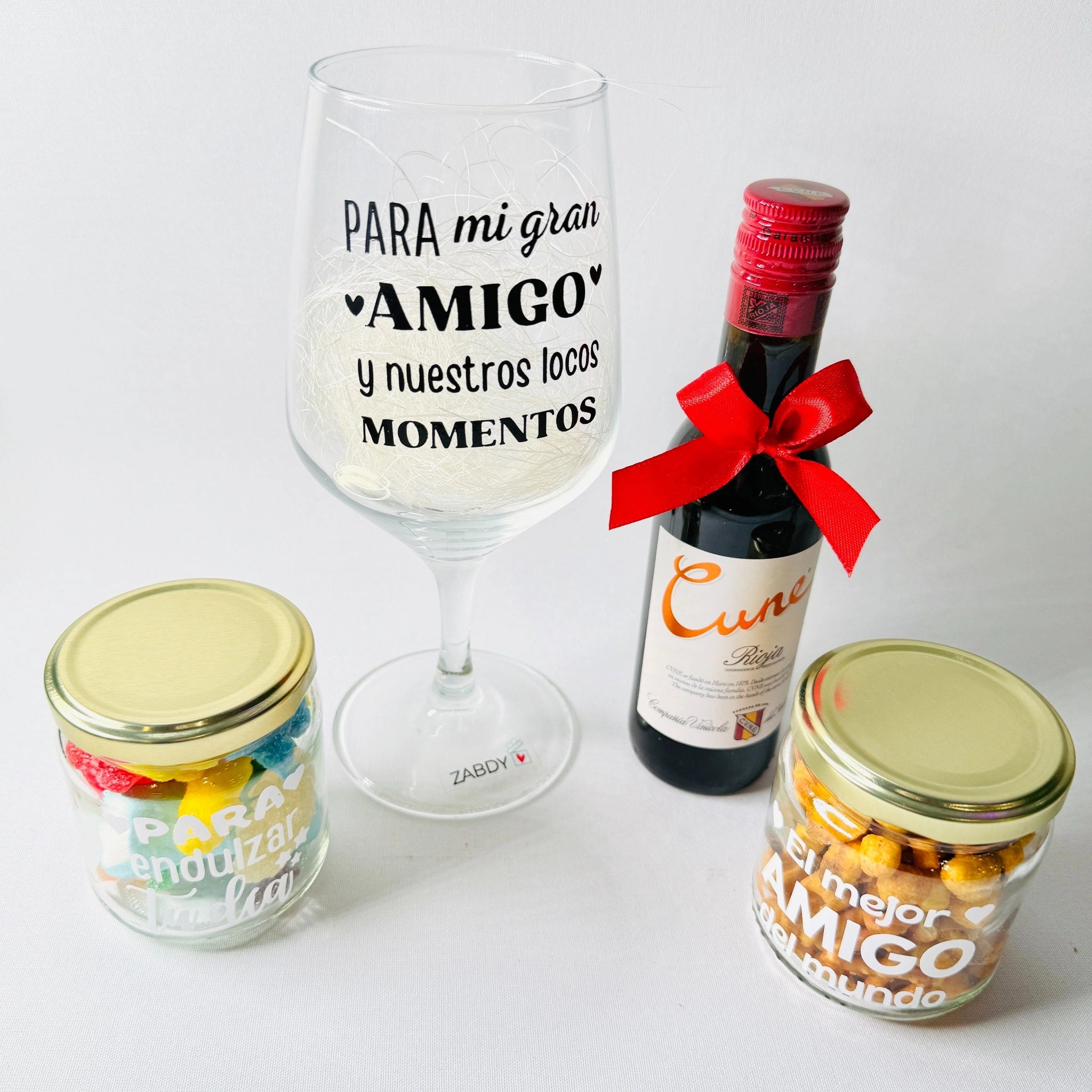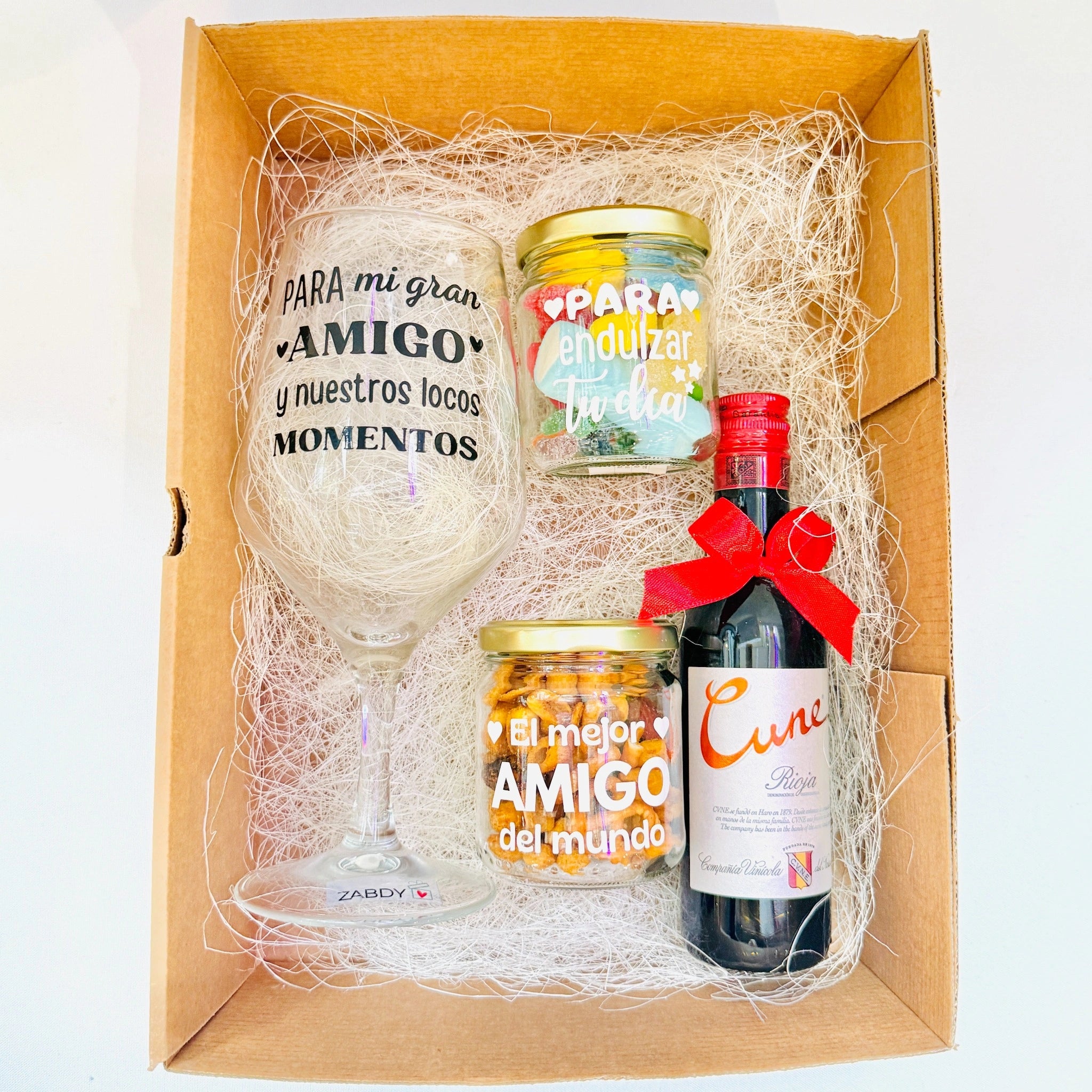 Una caja pensada para brindar, disfrutar y recordar lo importante que es tener amigos de verdad. Incluye una copa de vino personalizada, una botella de vino y botes que harán sonreír a quien la reciba. Perfecta para sorprender a ese amigo especial y compartir juntos un momento lleno de cariño...