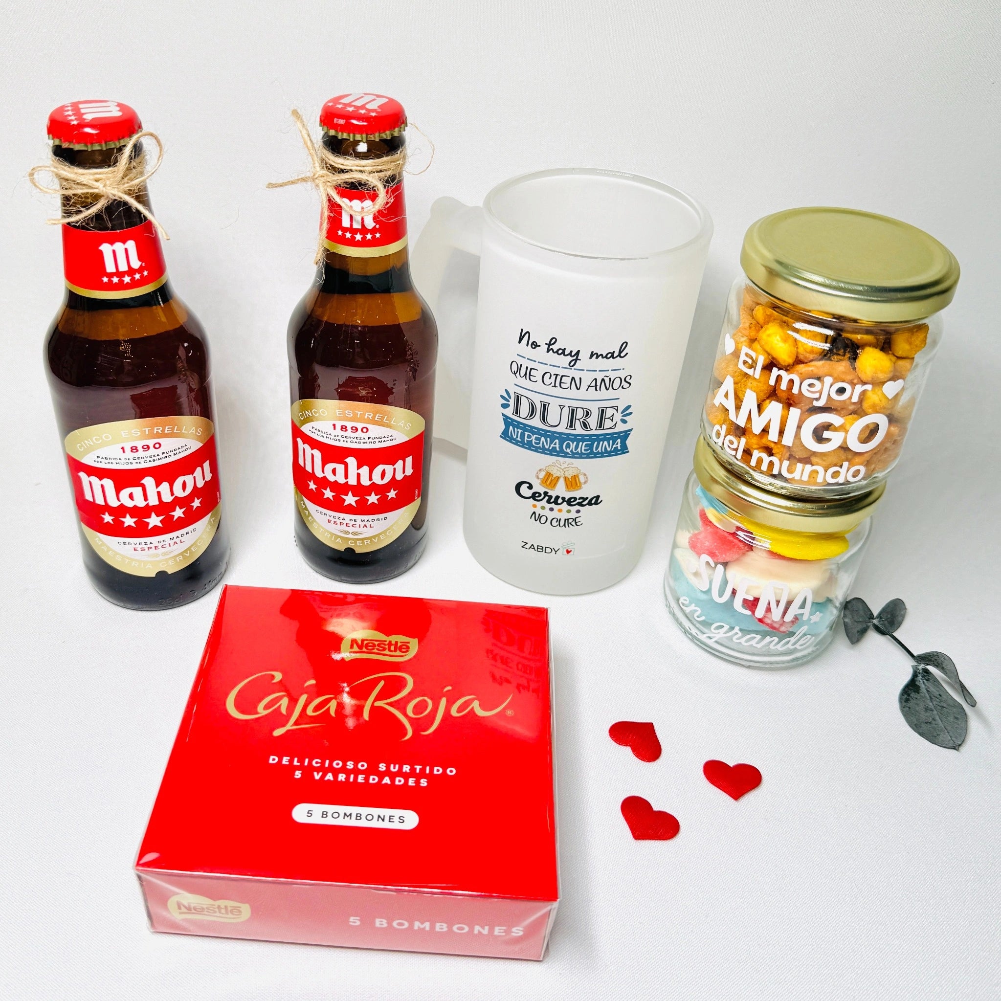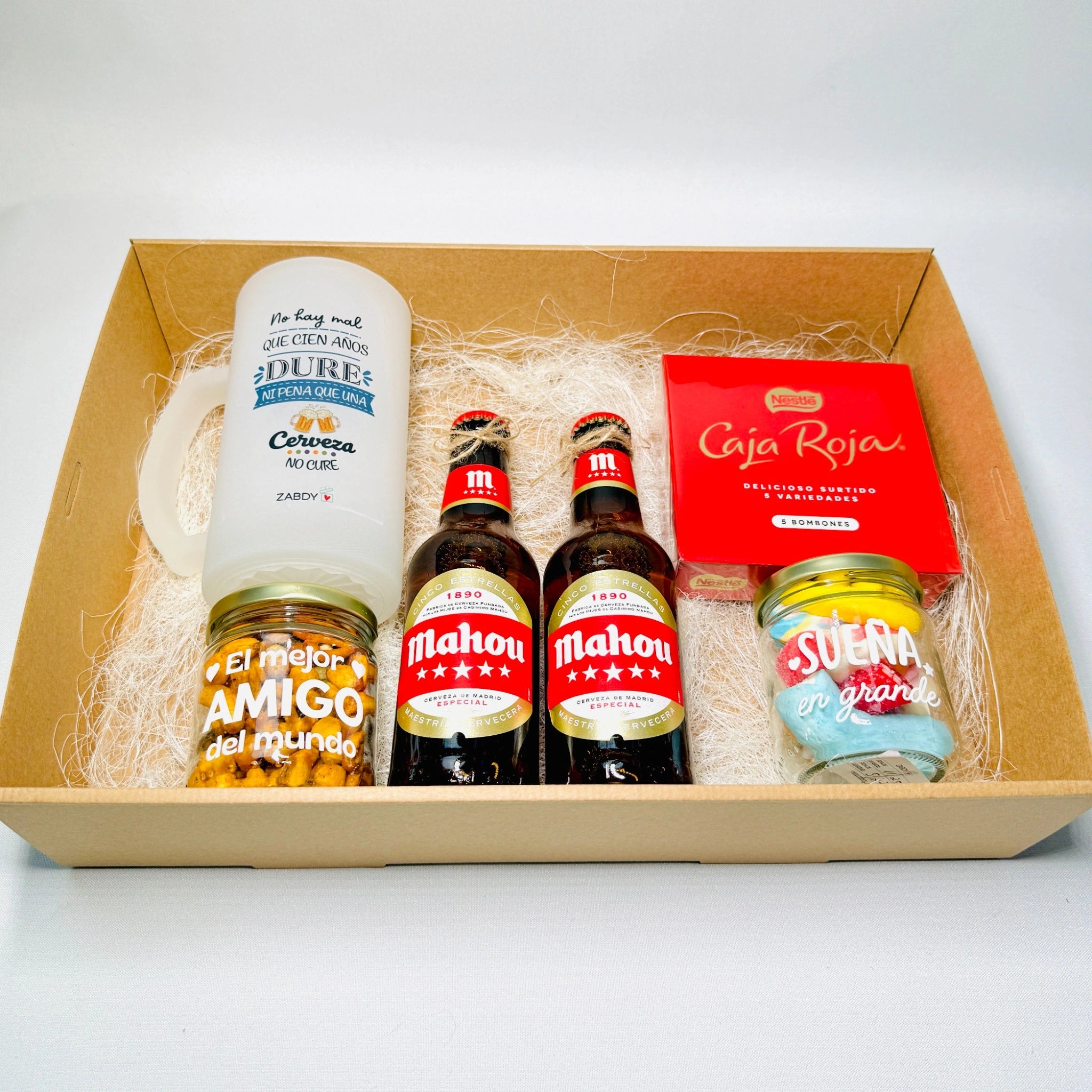 Sorprende a ese amigo especial con una caja pensada para disfrutar juntos de los pequeños placeres de la vida. Incluye cervezas, bombones, una jarra con mensaje divertido y botes dulces y salados detalles que despiertan sonrisas. Todo cuidadosamente presentado en una caja kraft de ventana con lazo, lista para regalar y celebrar la amistad. Ideal para recordarle cuánto significa tenerlo cerca.