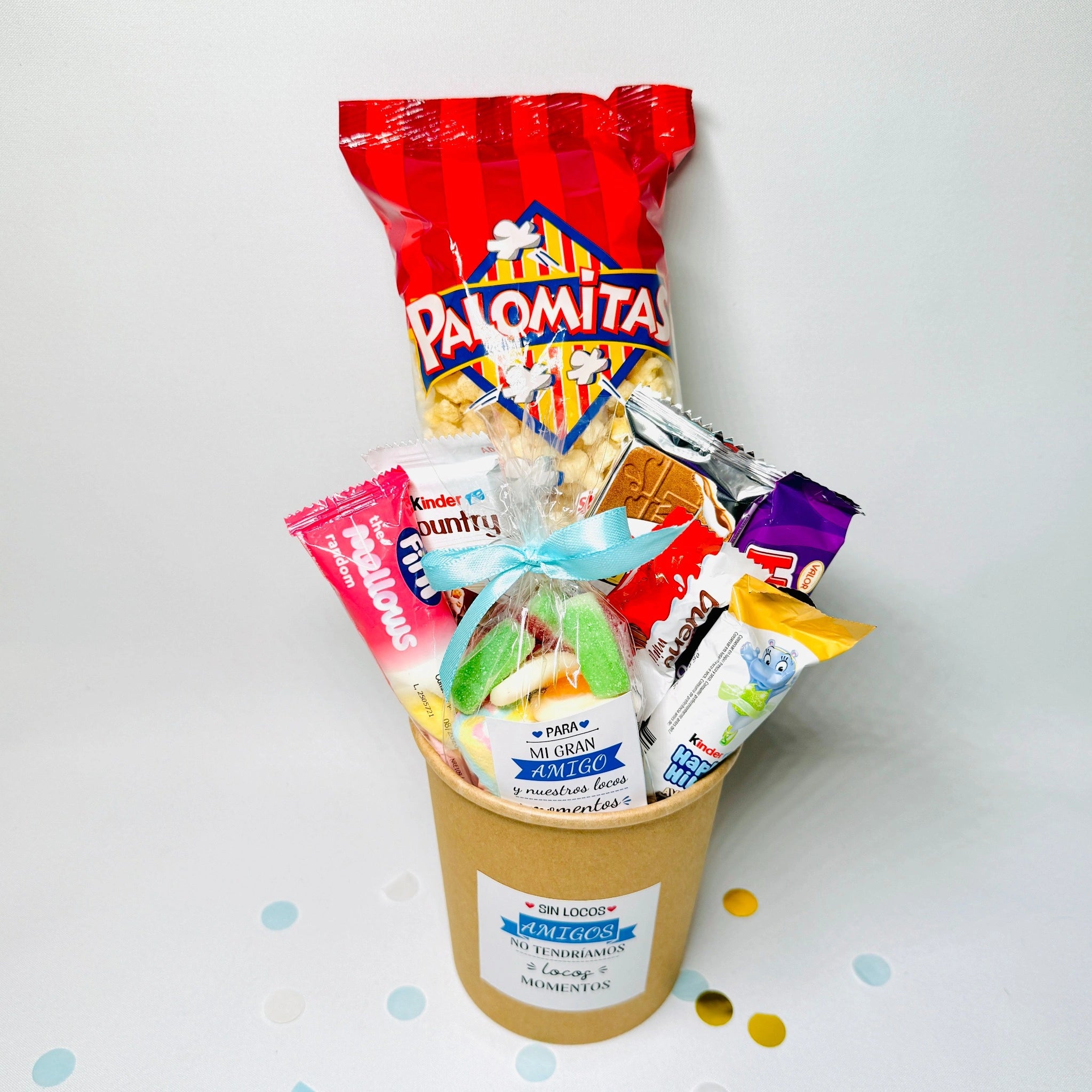 Un regalo divertido, dulce y lleno de sabor. Este tarro grande combina una selección de chocolates irresistibles y snack con un mensaje que celebra las amistades auténticas. Ideal para sorprender, compartir o incluir en una caja personalizada con toque especial. Las chocolatinas podrían variar según la disponibilidad de nuestros productos.Los...