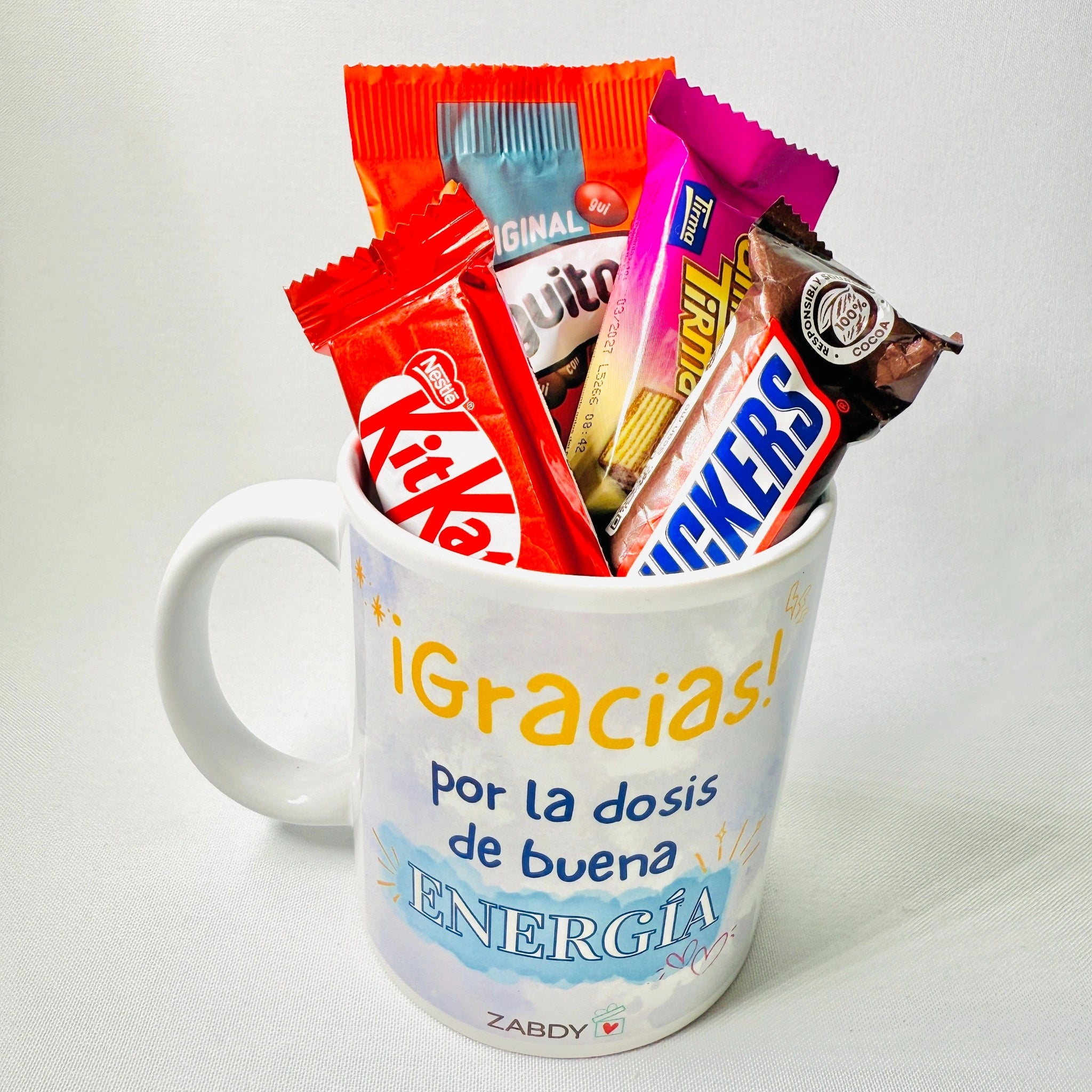 Un detalle lleno de dulzura y gratitud. Esta taza incluye una deliciosa combinación de chocolates y barritas variadas (pueden variar según disponibilidad), perfecta para sorprender a esa persona que siempre transmite buena energía.Ideal para regalar a amigos o compañeros que te inspiran día a día. La taza, de cerámica blanca...