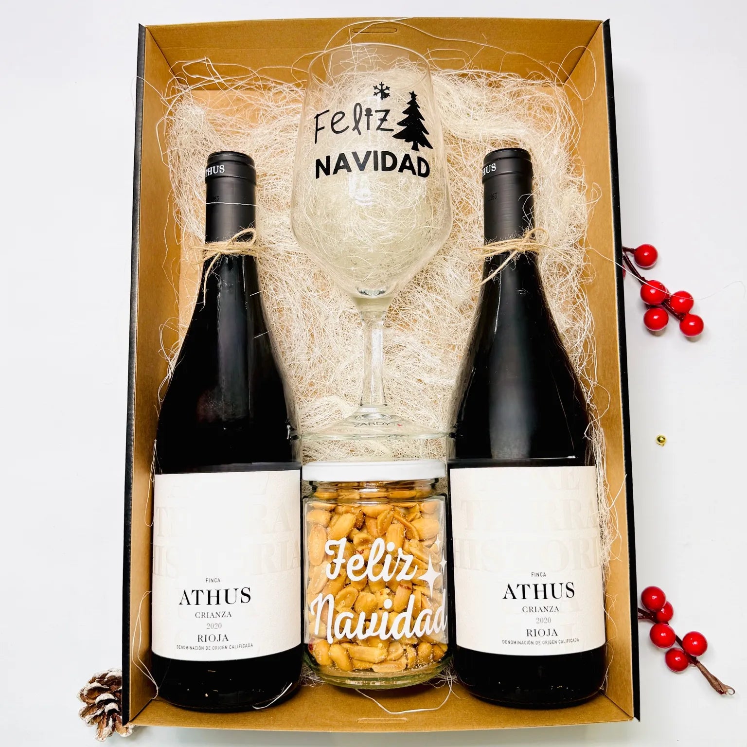 Caja Regalo Navidad con 2 Vinos Crianza + Copa Personalizada “Feliz Navidad” + Snack Gourmet