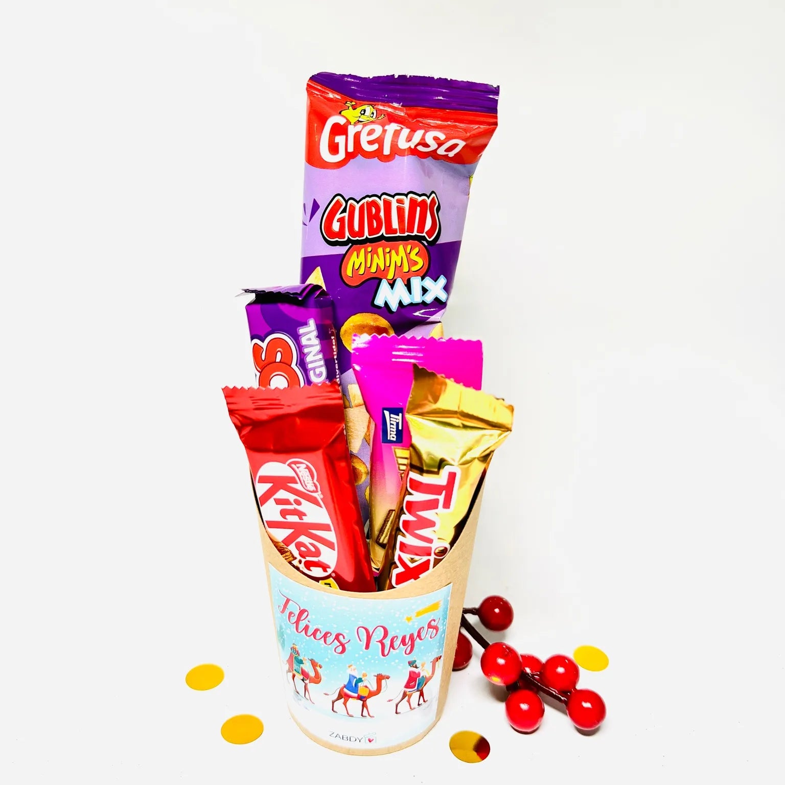 Nuestra Mini Composición Reyes es el detalle ideal para sorprender estas fiestas con un regalo delicioso, colorido y listo para disfrutar. Cada unidad incluye una selección de chocolates y snacks en tamaño mini, presentados dentro de un vaso decorado con diseño especial de Reyes, envuelto en celofán y rematado con...