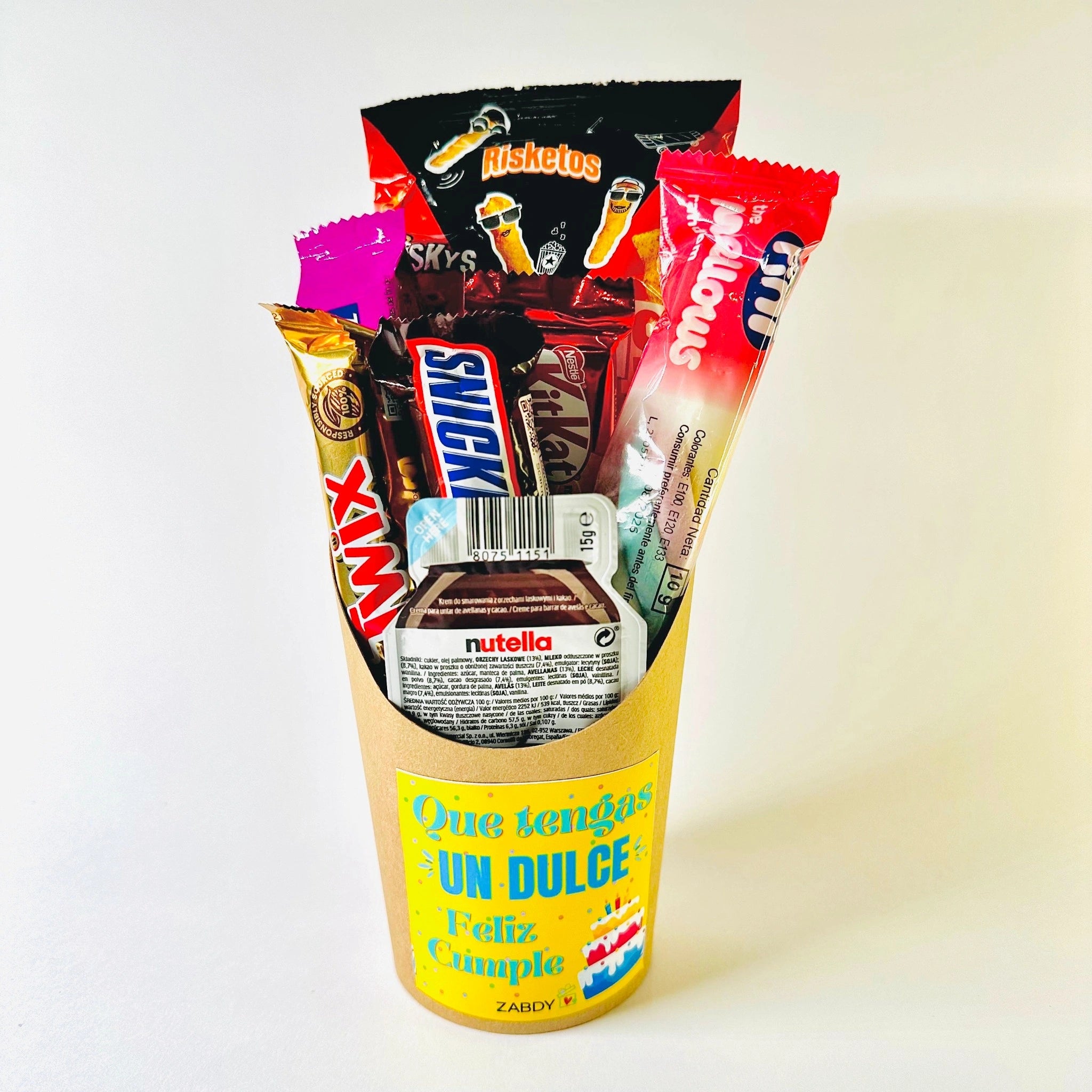 La petaca dulce cumpleaños es un detalle irresistible para celebrar con humor, color y mucho sabor.Llena de chocolates, gominolas y snacks deliciosos, está pensada para sacar sonrisas. Su presentación con mensaje “Que tengas un dulce feliz cumple” la convierte en un regalo original, perfecto para cumpleaños sorprender a amigos, pareja...