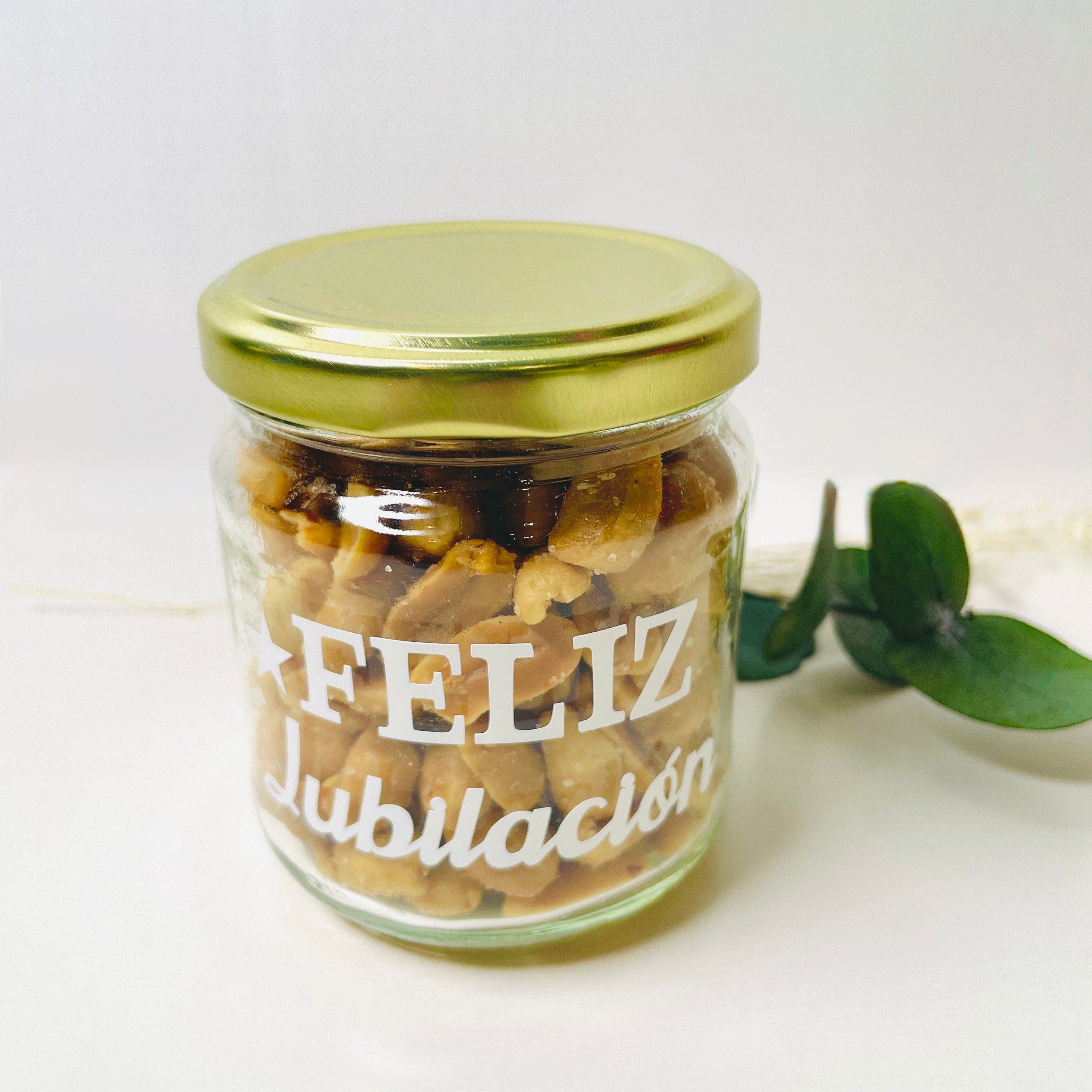 Un detalle sencillo pero lleno de significado. Nuestro bote de frutos secos con la frase “Feliz Jubilación” es perfecto para regalar a esa persona que comienza una nueva etapa. Un regalo útil, original y con un mensaje que emociona. Ideal como detalle individual o para añadir a una caja o cesta personalizada.