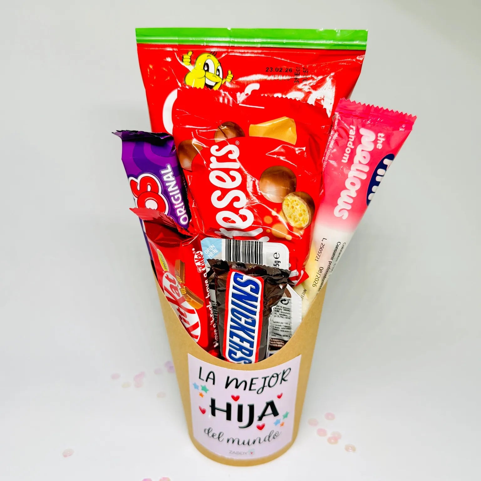 Sorprende a tu hija con una composición dulce personalizada llena de detalles y sabores irresistibles. Cada vasito kraft incluye una selección productos:Gublins Grefusa, Maltesers, Huesitos, KitKat mini, Snickers mini, una barrita Ambrosías Tirma, un stick de nubes Fini y una monodosis de Nutella, formando un regalo variado, divertido y perfecto...