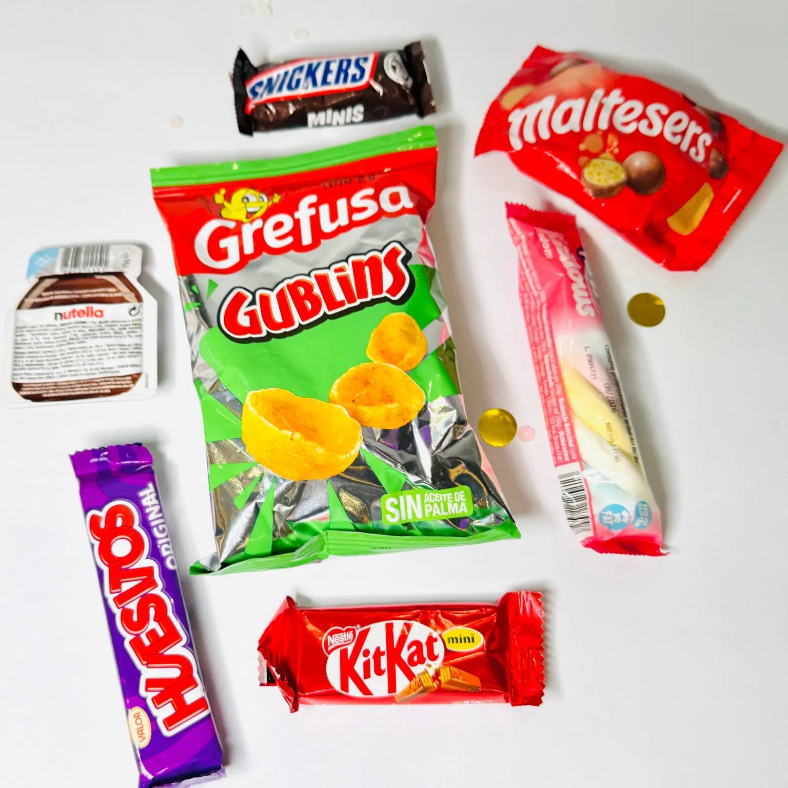 Gublins Grefusa, Maltesers, Huesitos, KitKat mini, Snickers mini, una barrita Ambrosías Tirma, un stick de nubes Fini y una monodosis de Nutella, formando un regalo variado, divertido y perfecto para endulzar su día.