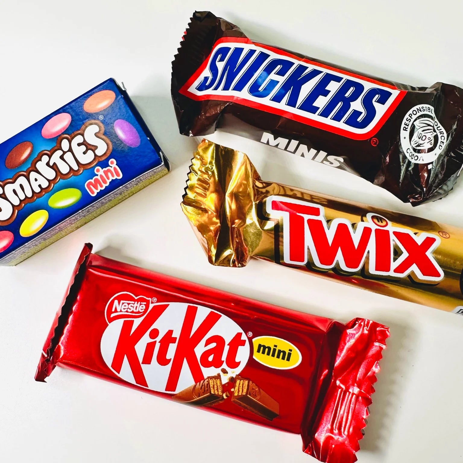 Dentro de la taza encontrarás: Twix mini, KitKat mini, Snickers mini y Smarties mini.