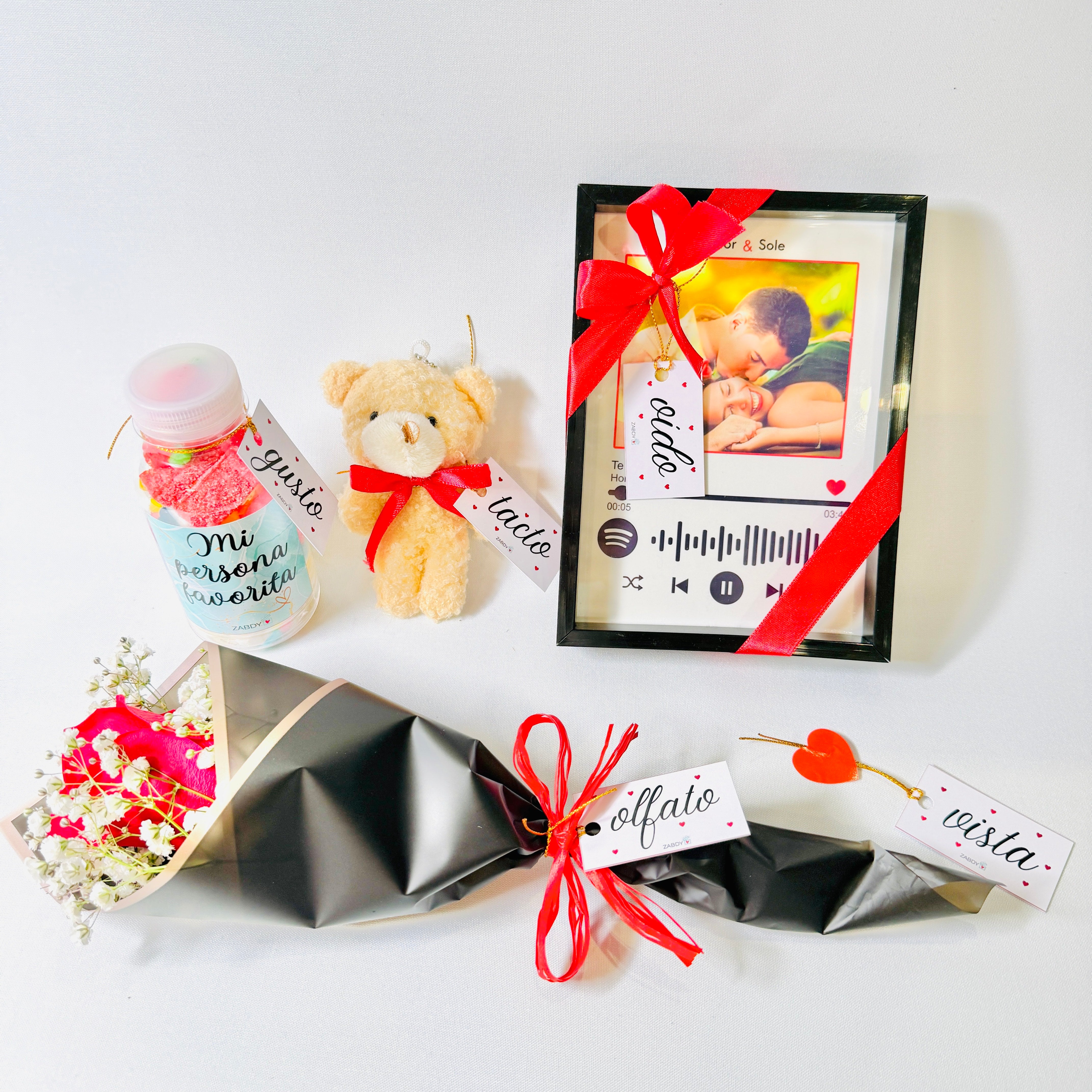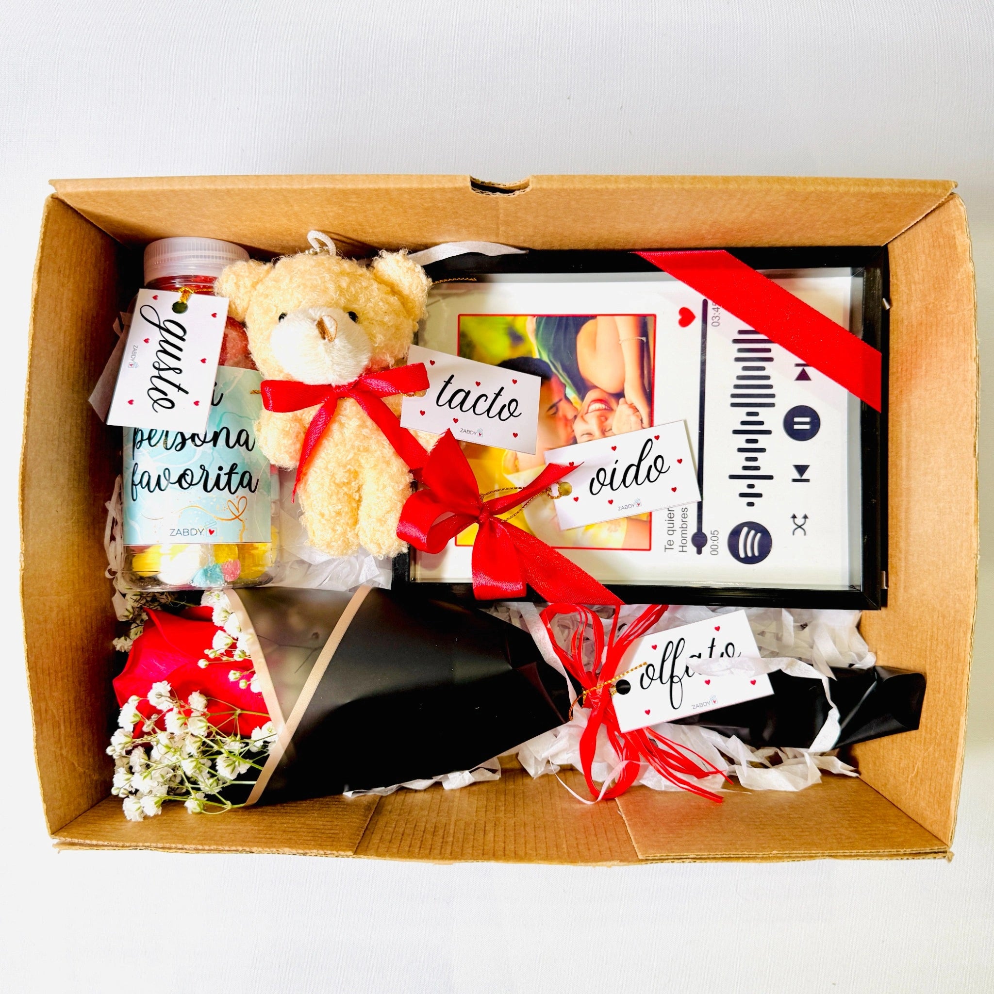 La Caja Regalo “Te Amo con Todos mis Sentidos” es la manera más original y romántica de decir te amo. Diseñada para emocionar, reúne detalles pensados para despertar cada sentido: vista, tacto, gusto, olfato y oído. Contenido: Vista: caja con mensaje Oído: Portarretrato personalizado Spotify Tacto: Mini osito Gusto: Botella...