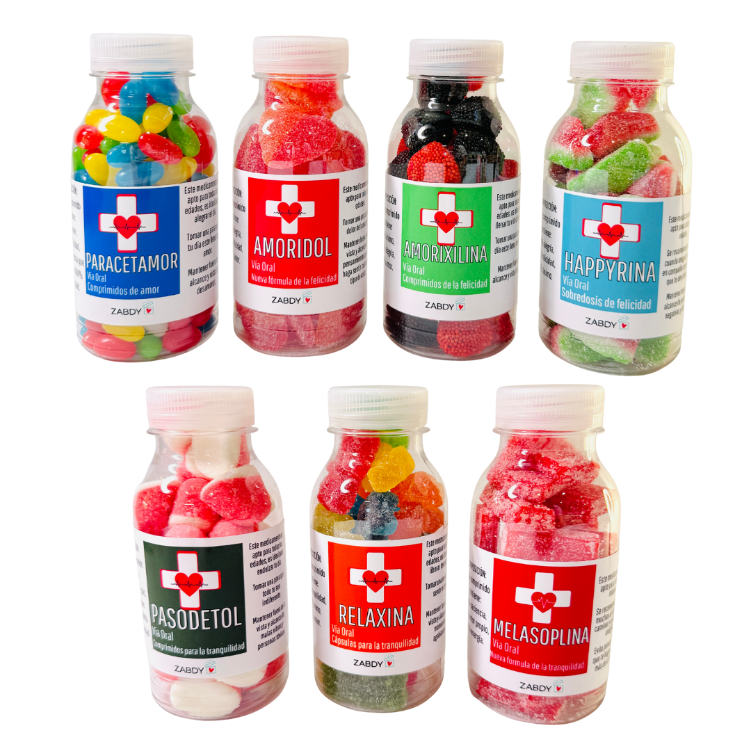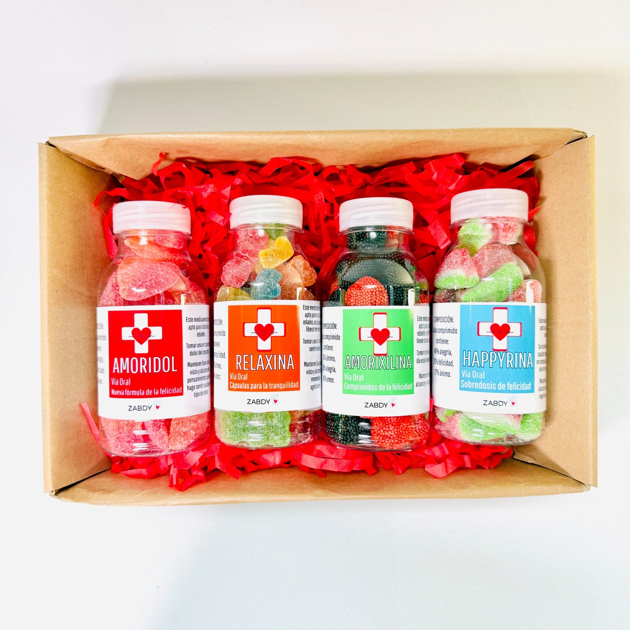 El PharmaChuches – Kit de Primeros Auxilios Dulces es un detalle creativo que convierte las chucherías en auténticos “remedios” para el corazón. Su exterior imita un kit de primeros auxilios y en su interior encontrarás cuatro botellines llenos de gominolas con etiquetas originales y mensajes divertidos como Un regalo único...