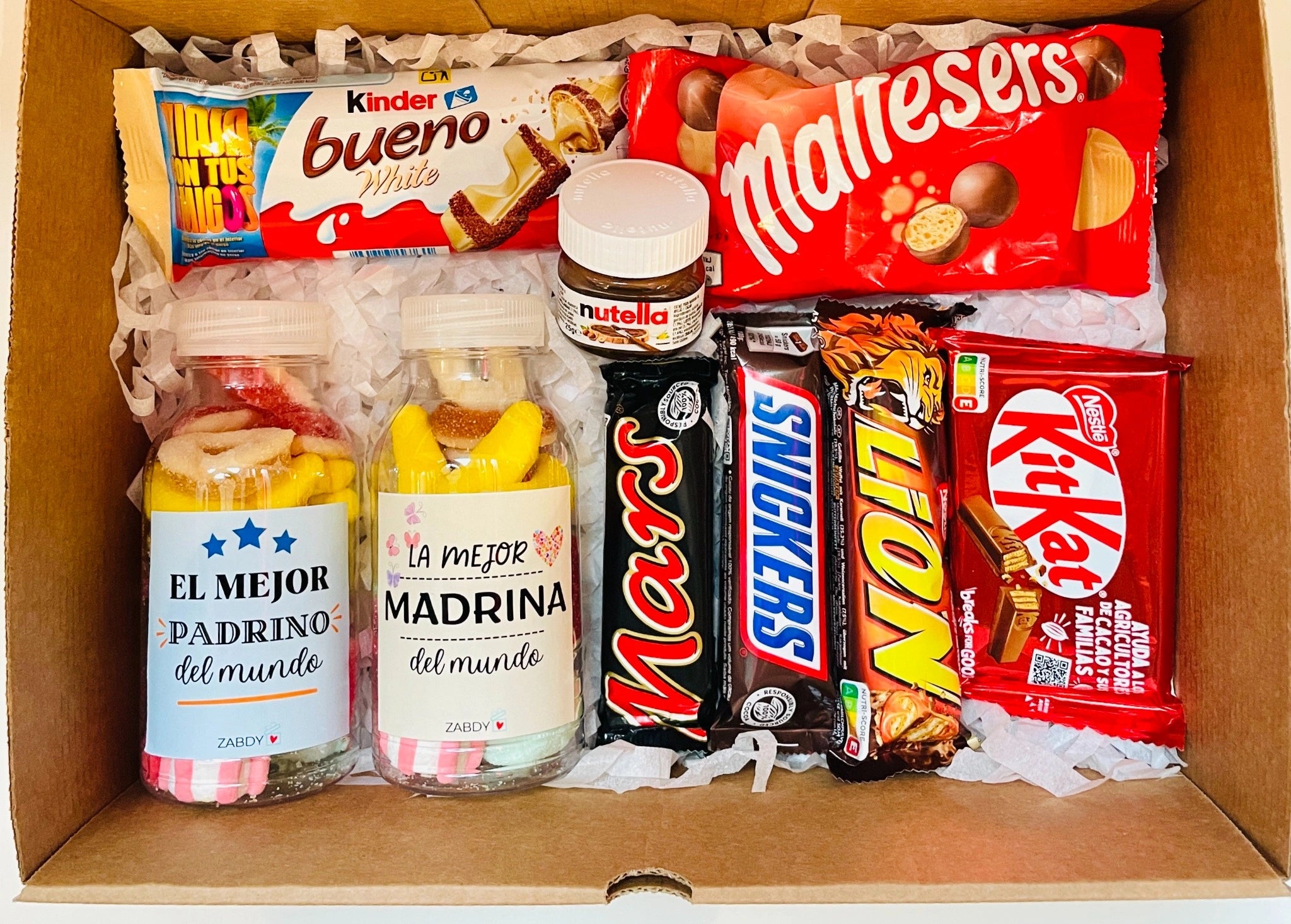 Una dulce manera de agradecer a los mejores padrinos. Esta caja incluye un surtido de chocolatinas y botellas de gominolas con mensajes llenos de cariño. Un detalle ideal para sorprender y agradecer su amor, apoyo y complicidad en momentos especiales. Contenido: Caja con mensaje Mix de chocolates (Mars, snickers, kitkat,...