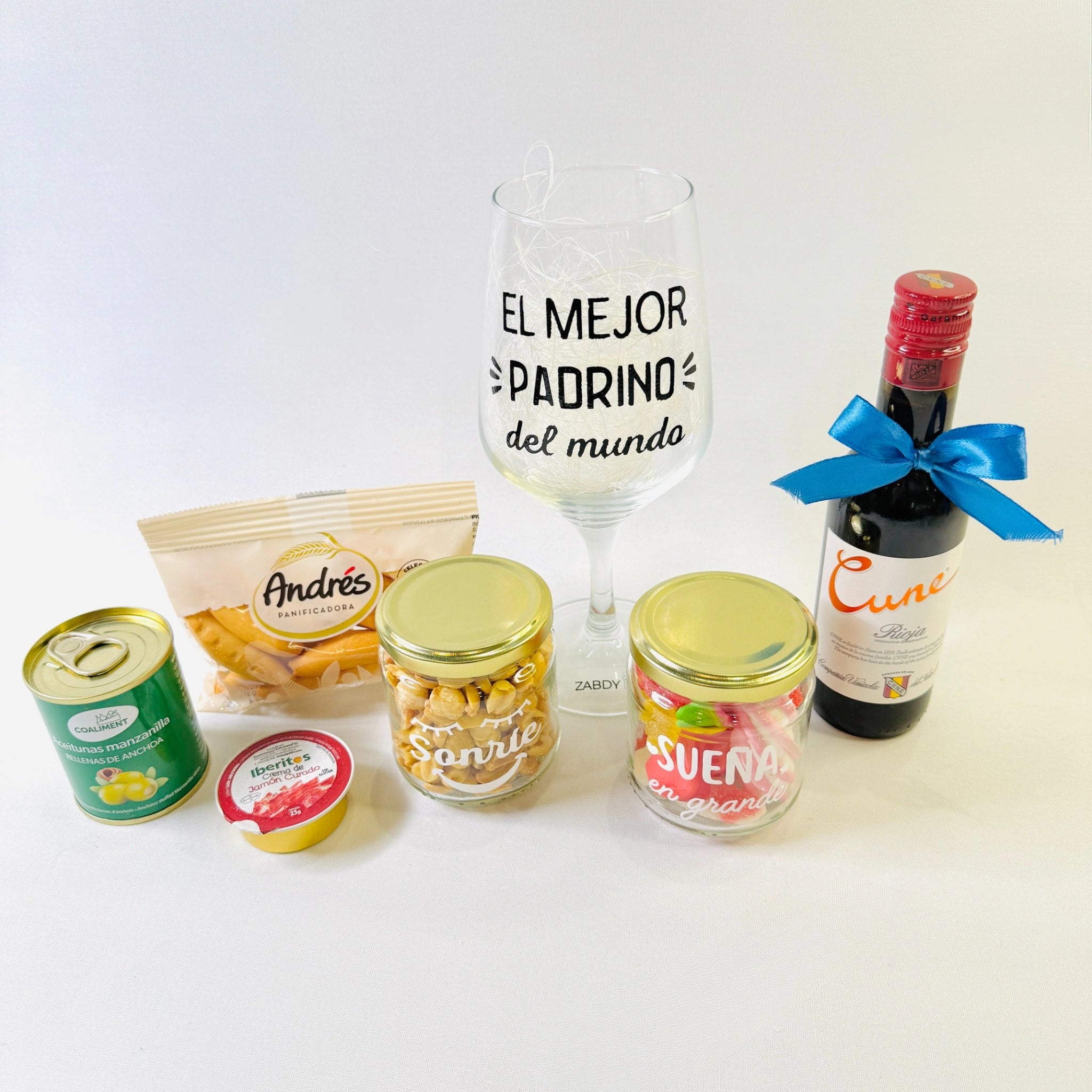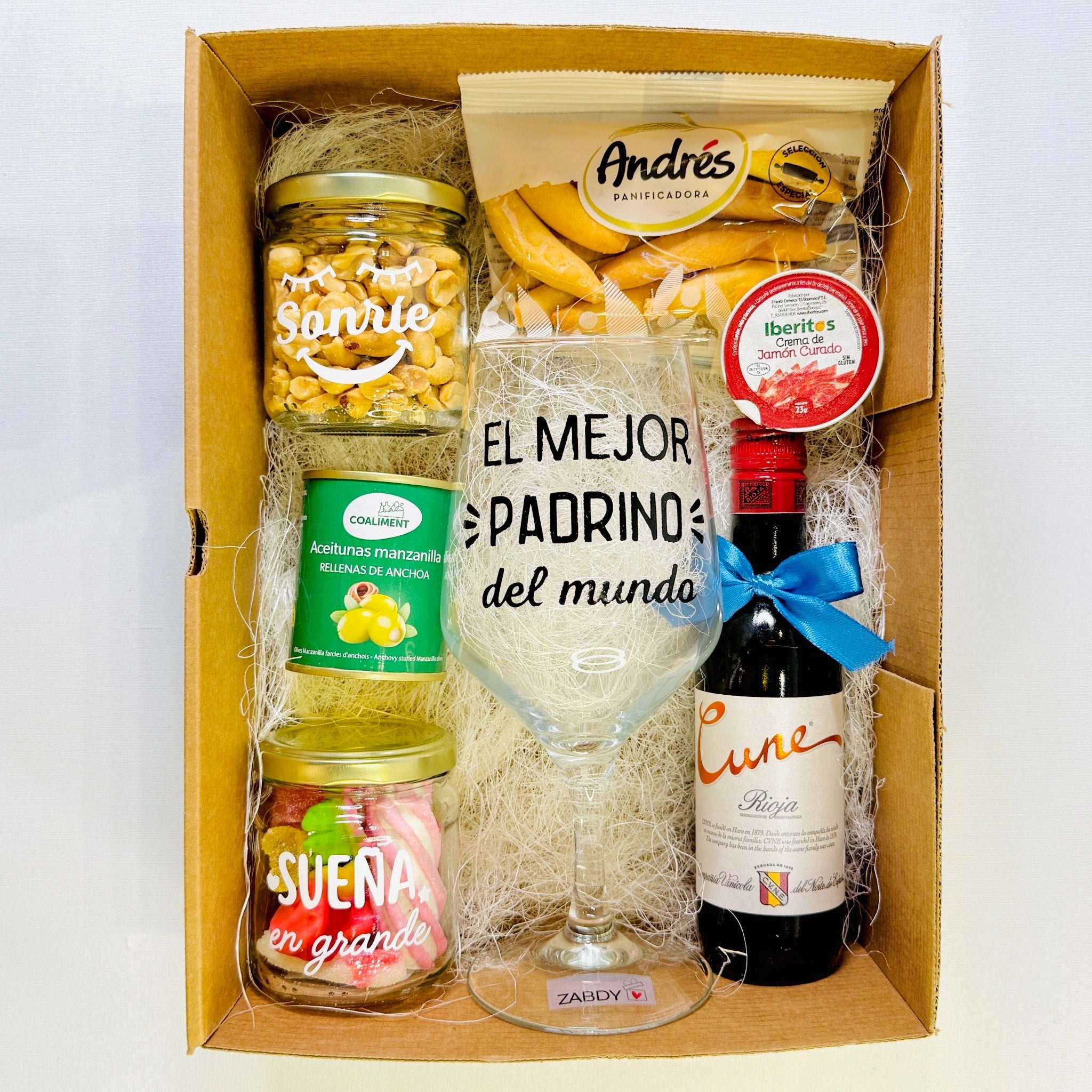 Una forma original y emocionante de anunciar una gran noticia. Esta caja regalo combina detalles dulces y gourmet con una copa grabada especialmente para padrinos únicos. Un detalle lleno de cariño que quedará como recuerdo de un momento inolvidable. Contenido: Caja con mensaje Copa de vino con mensaje “El mejor...