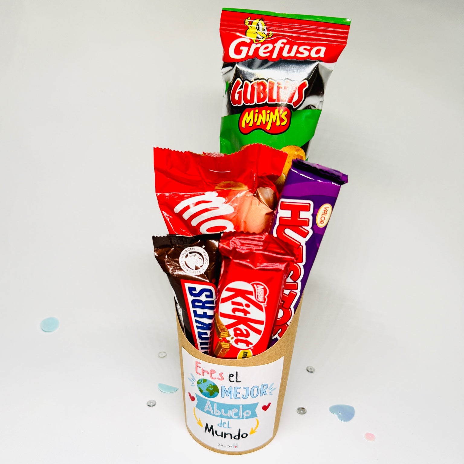 Una composición dulce y divertida para sorprender al abuelo que se merece absolutamente todo. Presentado en un vaso kraft personalizado con la frase “El mejor Abuelo del mundo”, este detalle reúne una selección de chocolatinas y snack, perfectos para regalar cariño en cada bocado.