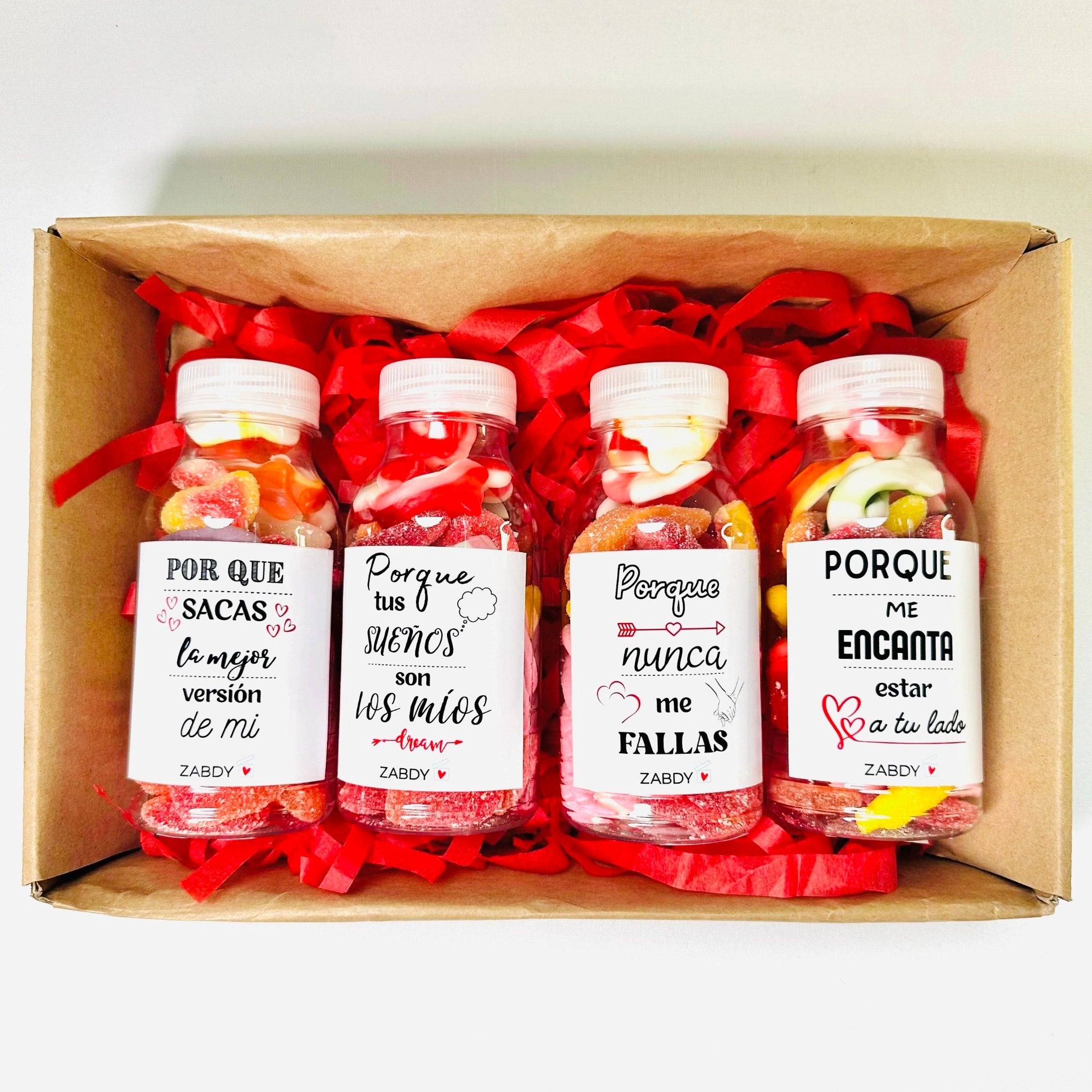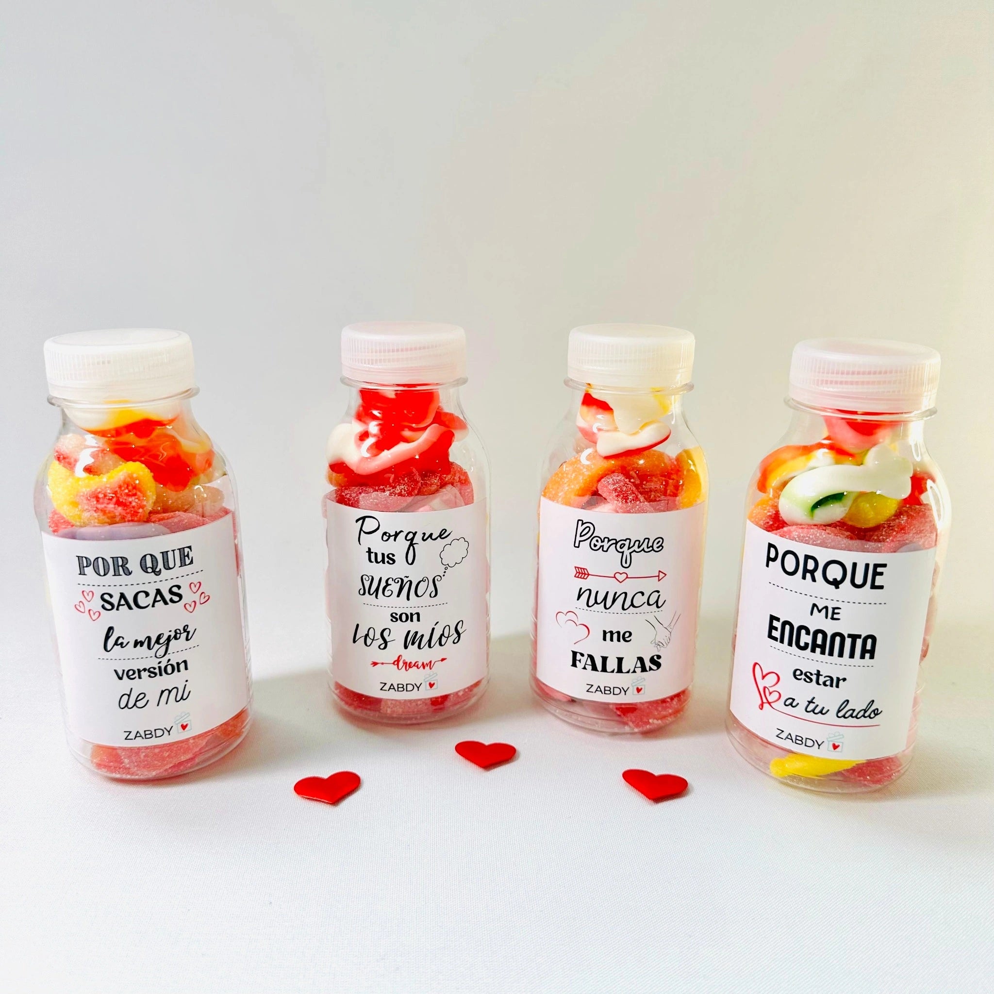 Un regalo lleno de emoción y ternura para demostrar cuánto significa esa persona para ti. Cada botella rellena de gominolas contiene un mensaje diferente que expresa amor, gratitud y complicidad, creando una experiencia única y especial.Perfecta para sorprender en fechas importantes o simplemente para recordar lo mucho que quieres a...