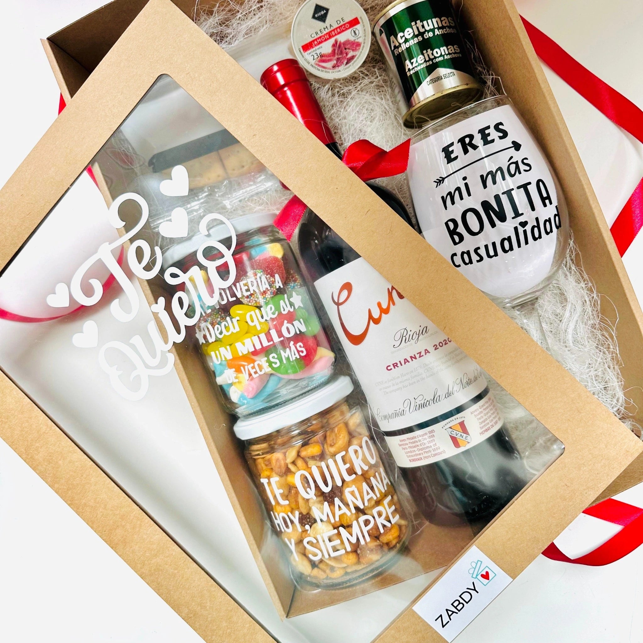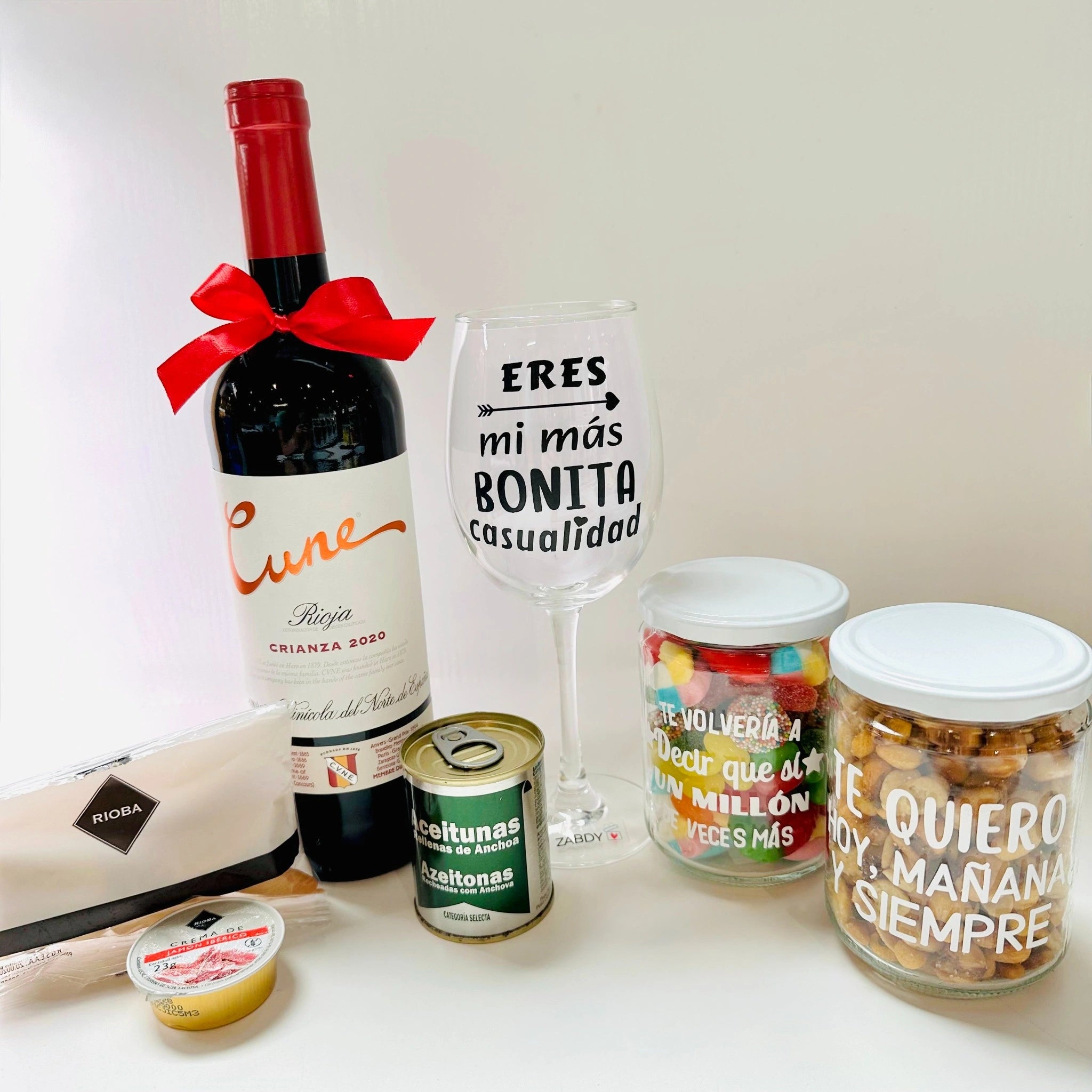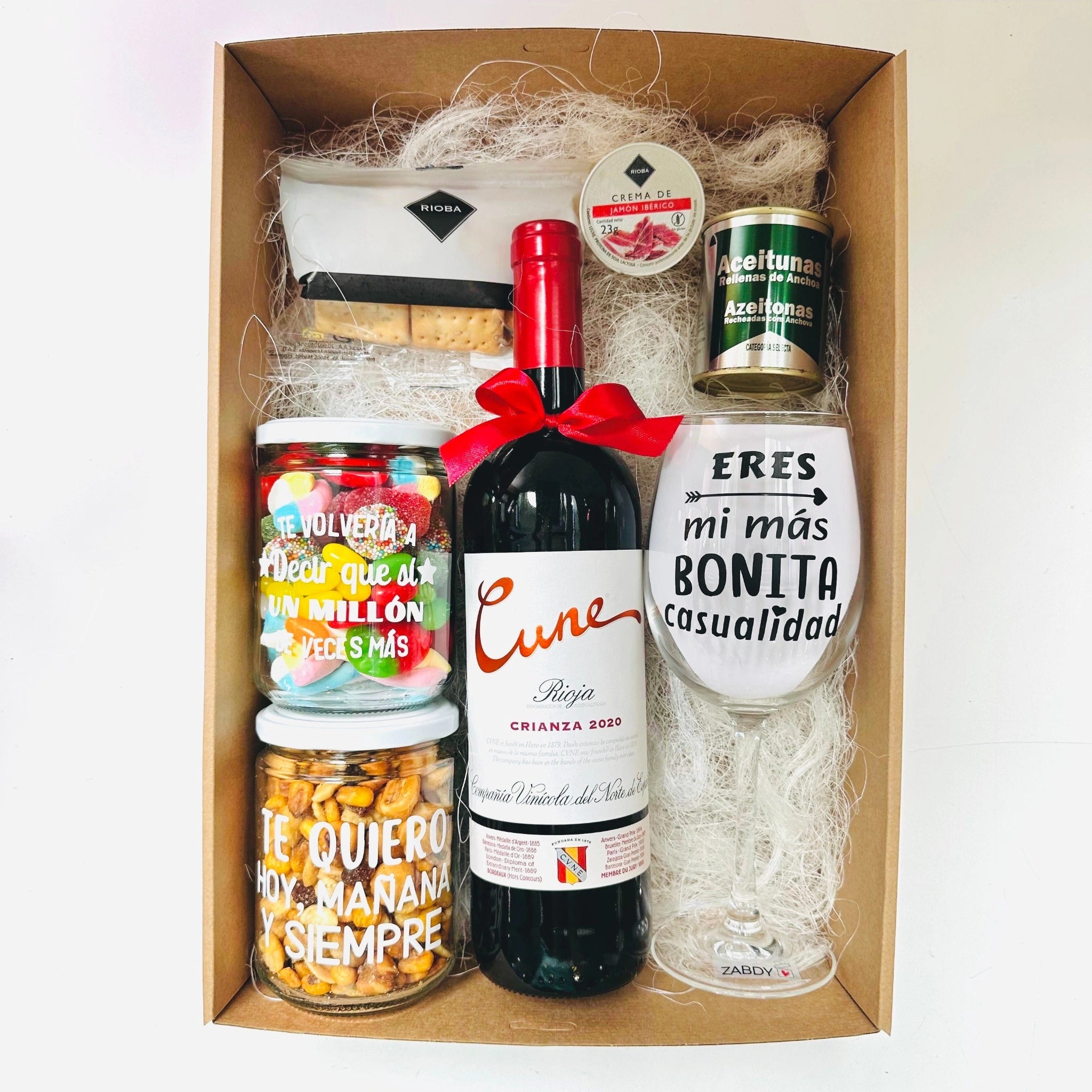 Un regalo elegante y lleno de detalles para celebrar el amor.Incluye una copa pintada a mano con mensaje romántico y una cuidada selección de productos que harán de cualquier ocasión un momento inolvidable. Ideal para sorprender a tu pareja con un brindis lleno de cariño y dulzura. Contenido: Caja con...