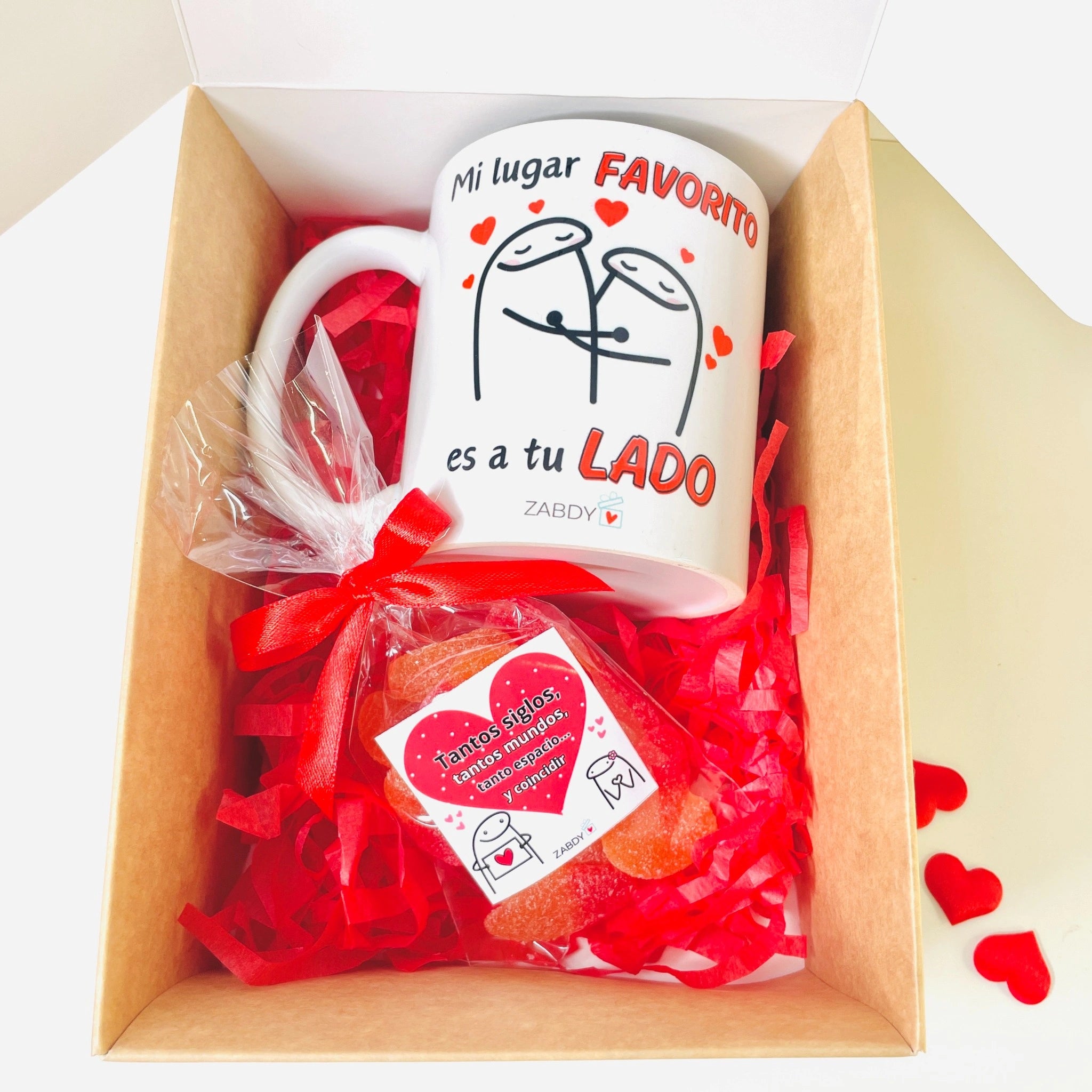 Incluye una taza con diseño romántico y gominolas que endulzan cualquier día especial. Ideal para regalar en aniversarios, San Valentín o simplemente para recordarle que tu lugar favorito siempre será a su lado.