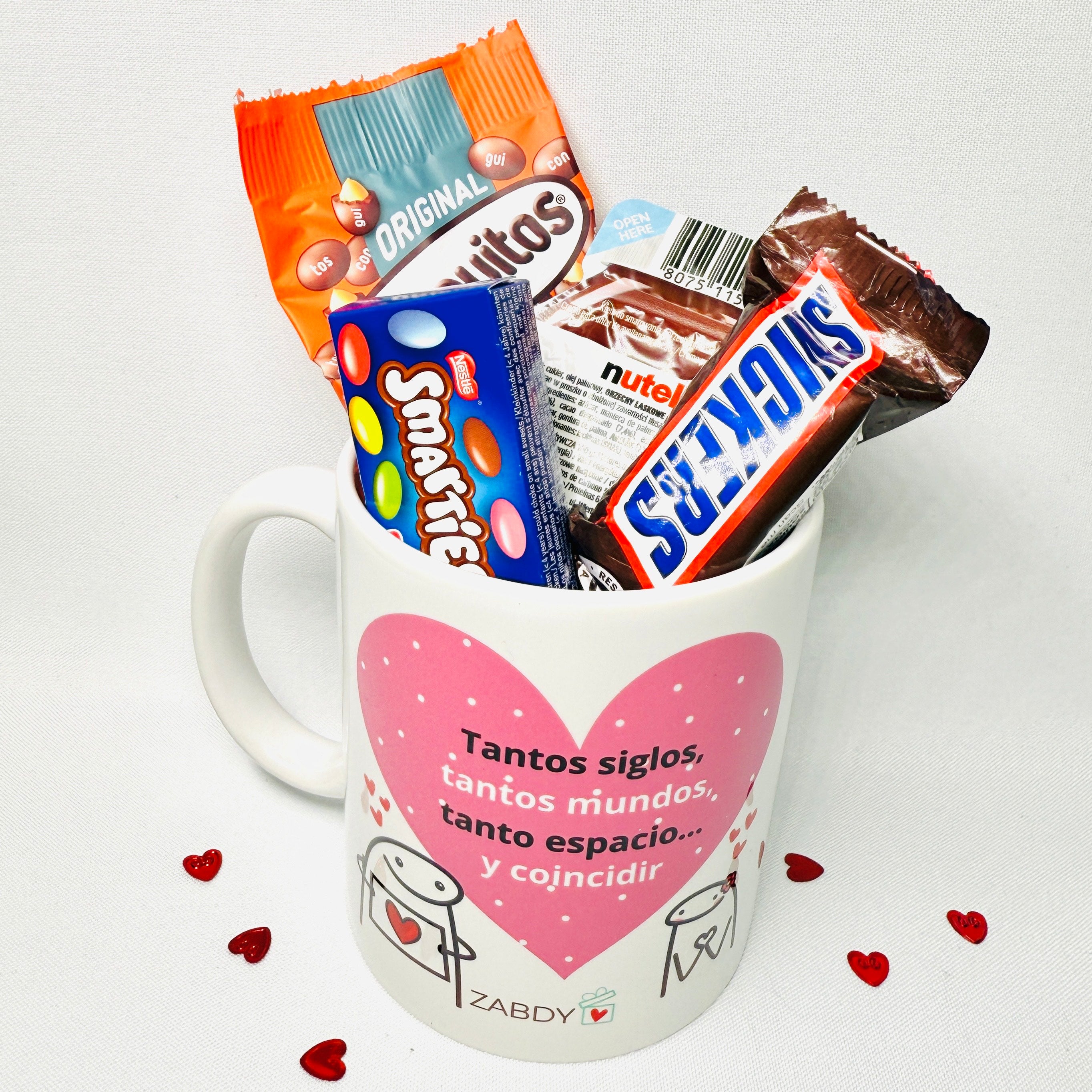Un detalle romántico que celebra la magia de coincidir. Esta taza con chocolatinas es perfecta para recordarle a tu persona especial que el destino los unió. Un regalo lleno de dulzura y emoción.
