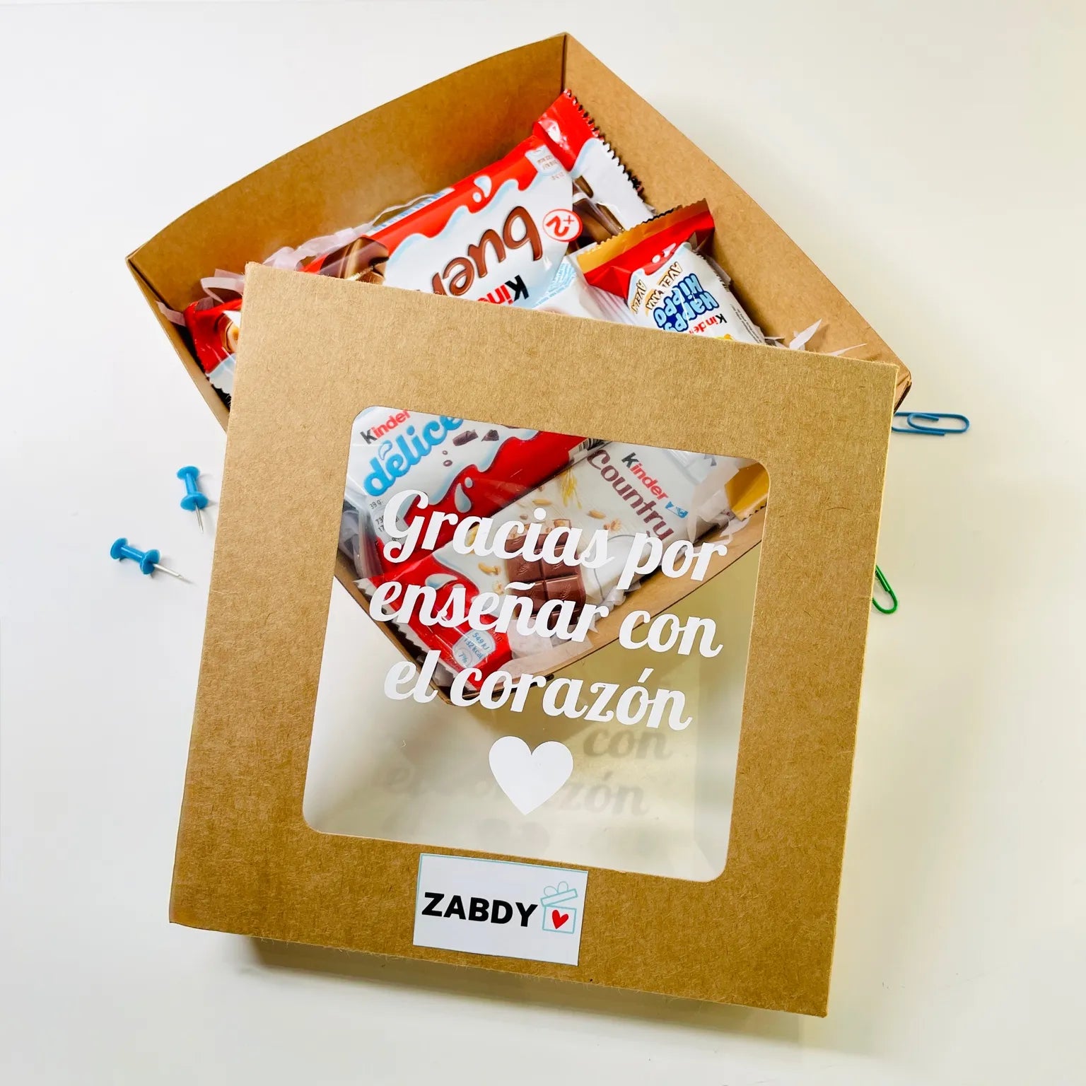 Caja regalo para profesor – Caja ventana con chocolates Kinder y detalles personalizados
