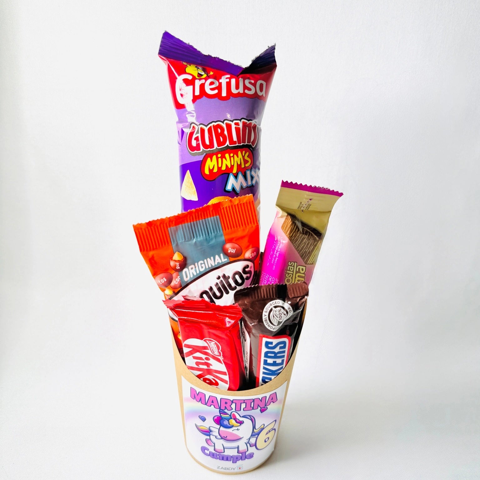 Este vaso dulce personalizado es una opción ideal como detalle para invitados en cumpleaños infantiles, pensado para sorprender a los más pequeños con un regalo colorido, práctico y totalmente personalizado. Incluye una cuidada selección de chuches y chocolatinas presentadas en un vaso resistente, decorado con una etiqueta temática de cumpleaños...