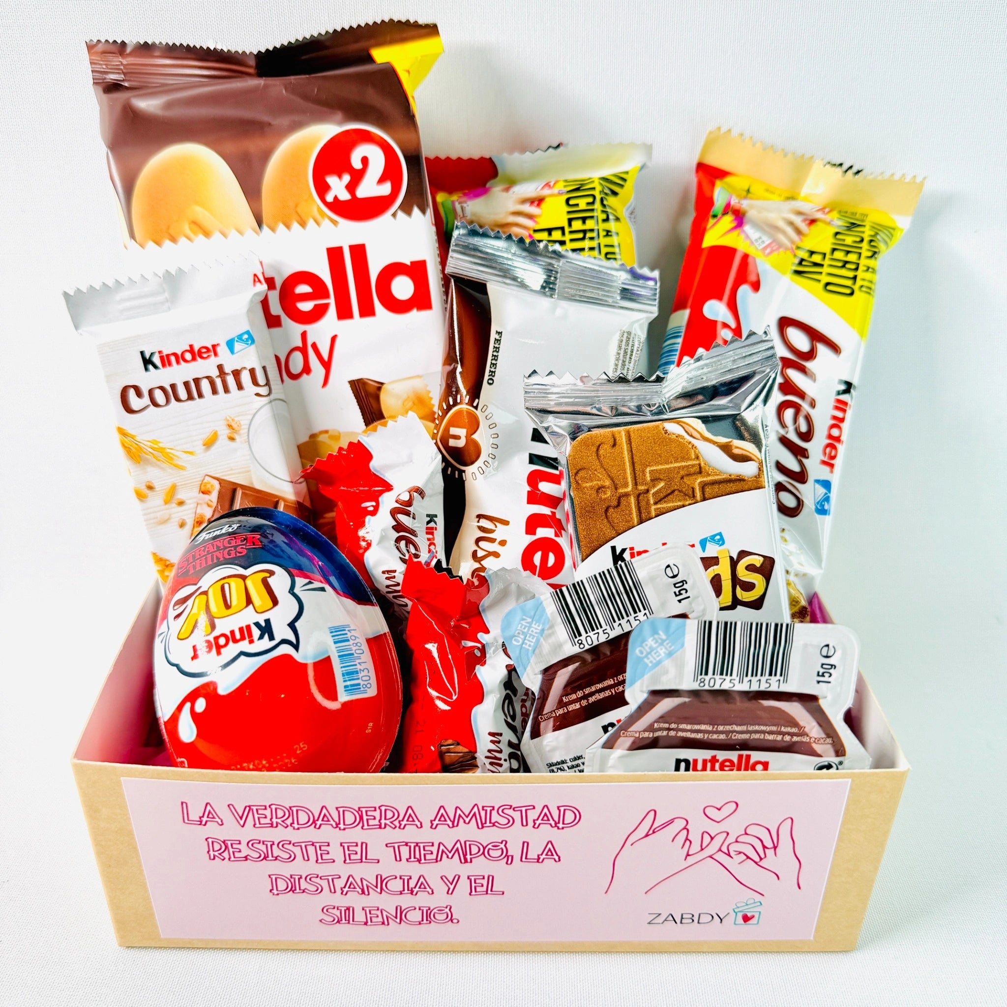 Celebra la amistad de verdad con una bandeja llena de dulces y significado. Esta preciosa presentación incluye un surtido de chocolatinas seleccionadas y un mensaje que llega directo al corazón. Un regalo que transmite cariño, cercanía y gratitud. Caja base con mensaje. Chocolates (Kinder Joy, Kinder bueno, Kinder Bueno White,...