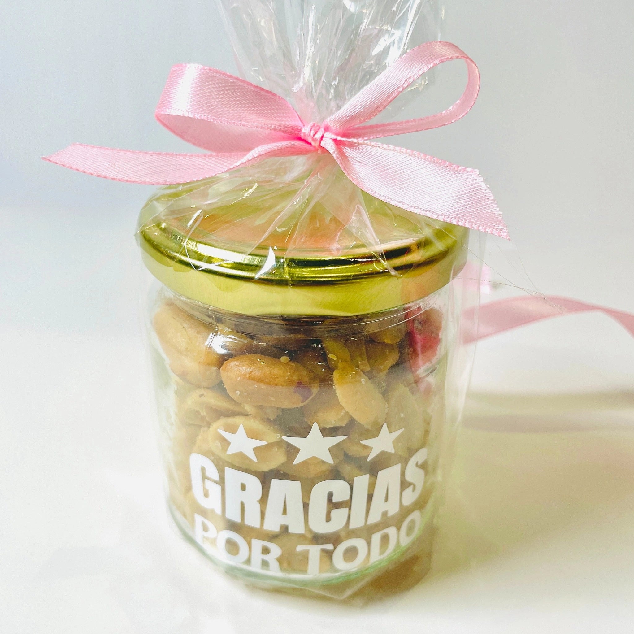 El bote de frutos secos “Gracias por todo” es una forma elegante de expresar agradecimiento. Su mezcla de frutos secos tostados viene presentada en un frasco de cristal reutilizable, adornado con un lazo que le da un toque encantador.Perfecto para incluir en cajas de regalo o como un detalle independiente...