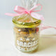 Celebra una amistad única con el bote de frutos secos “Qué suerte tenerte como amiga”, una combinación deliciosa presentada en un frasco de cristal con tapa y lazo decorativo.Ideal para complementar tus cajas de regalo o sorprender con un pequeño gesto lleno de cariño y significado.Elementos decorativos no incluidos.