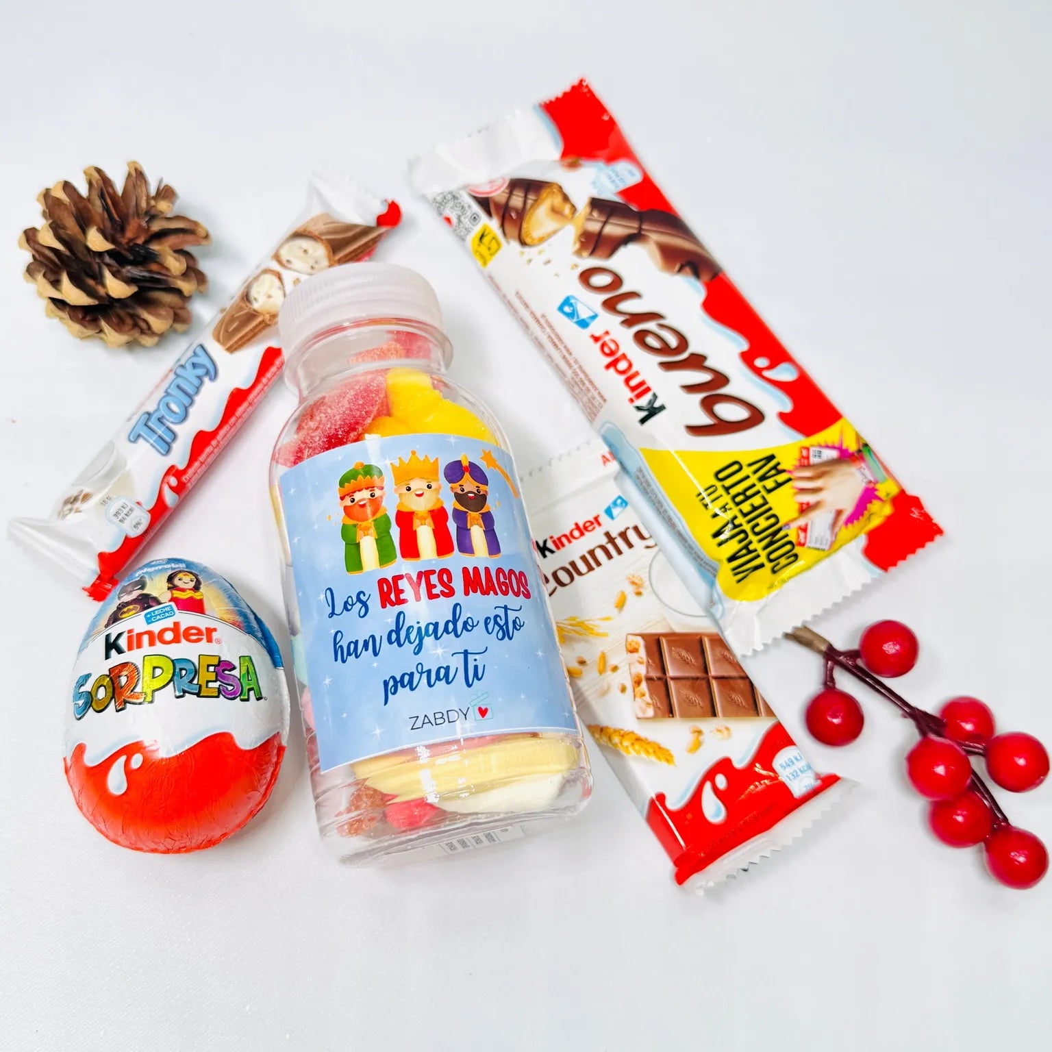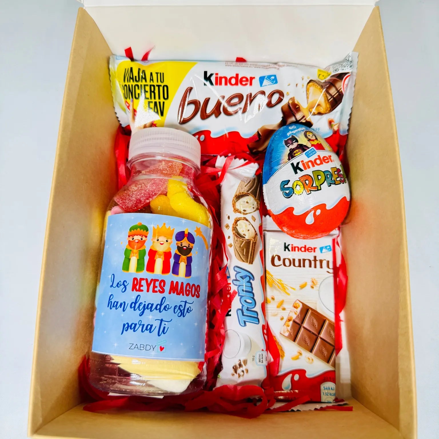 Caja Especial “Los Reyes Magos han dejado esto para ti” – Dulces Kinder y Botella de Gominolas