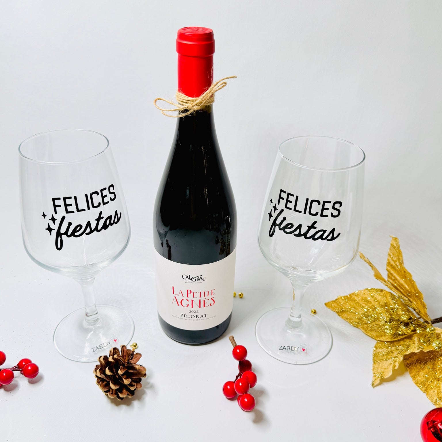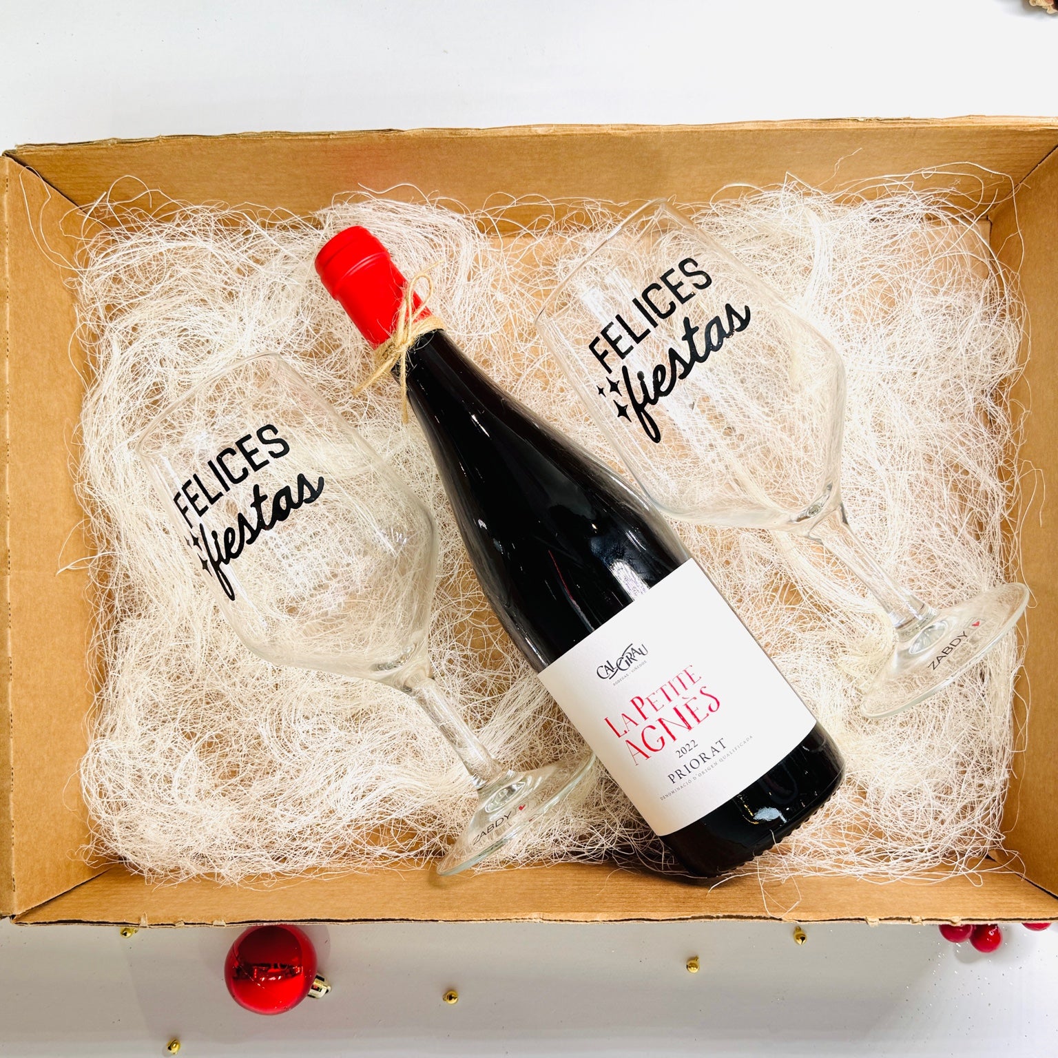 Pack regalo de vino con 2 copas grabadas – Felices Fiestas