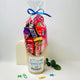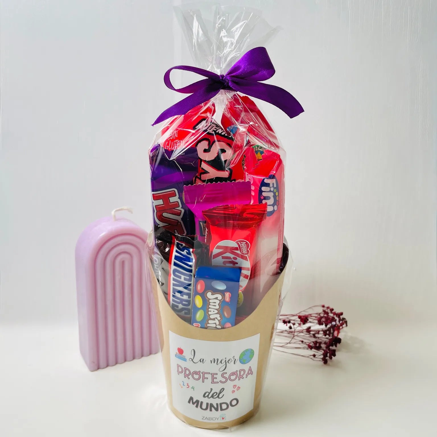 Incluye una selección variada de chocolatinas y gominolas, presentada con mucho cariño y envuelta en celofán con un lazo que convierte este detalle en un regalo listo para entregar.
