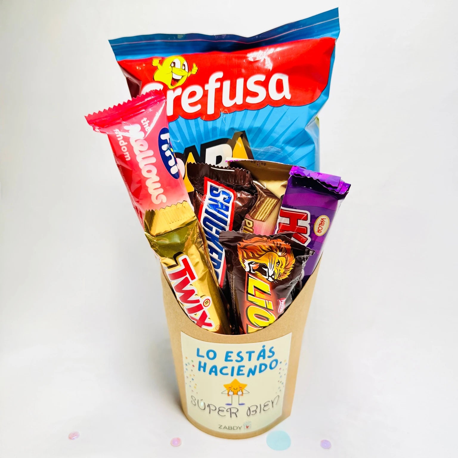 Sorprende con una composición dulce única, divertida y personalizada, presentada en un tarro kraft con mensaje especial “Lo estás haciendo súper bien”. Un detalle perfecto para motivar, alegrar el día y regalar un momento dulce lleno de energía. 🍫 Incluye: Bolsa de Grefusa Papadelta Mini Twix Mini Snickers Mini Lion...