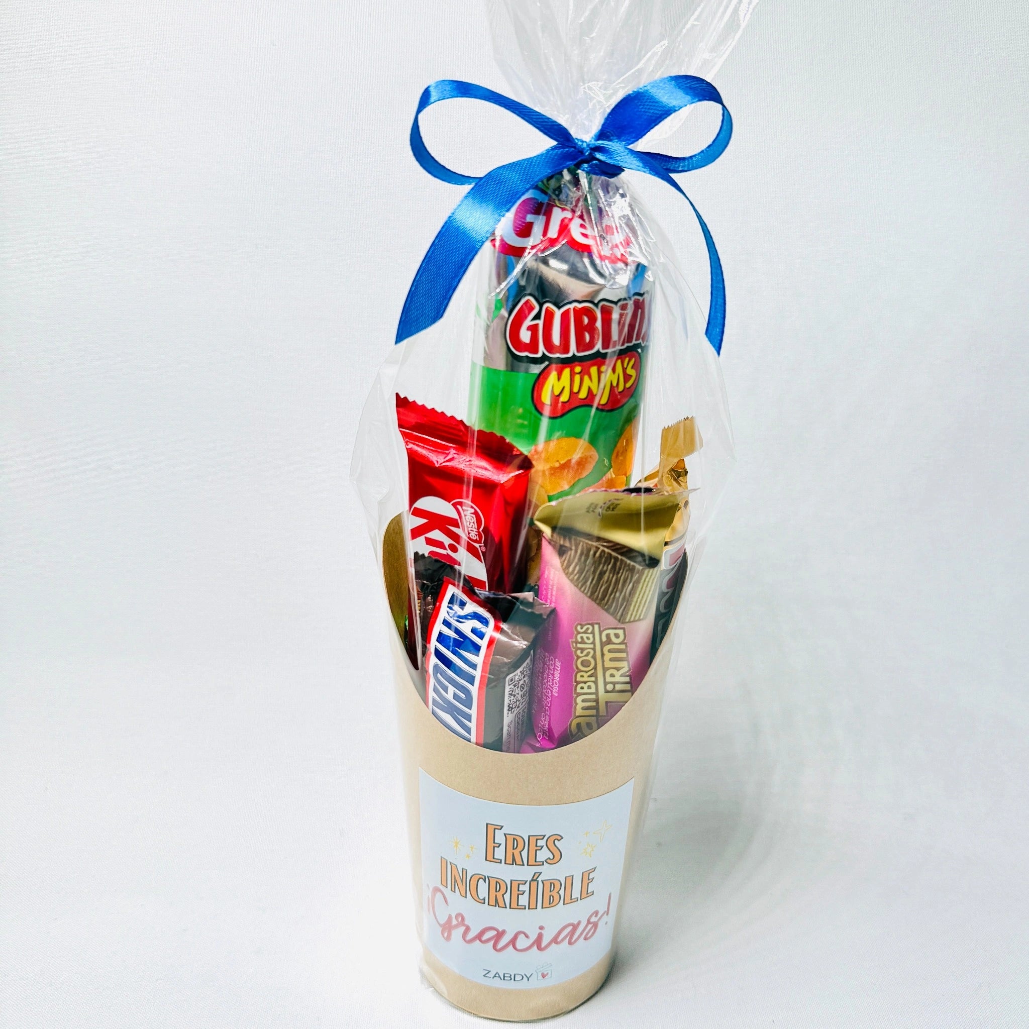 La petaca de chocolates “Eres increíble gracias” es un detalle tierno y sabroso con el que podrás expresar tu gratitud de una forma diferente.Rellena con una selección de chocolatinas y snack (sujeto a disponibilidad), esta petaca es ideal para regalar a una amiga, compañera o alguien que se merece una...