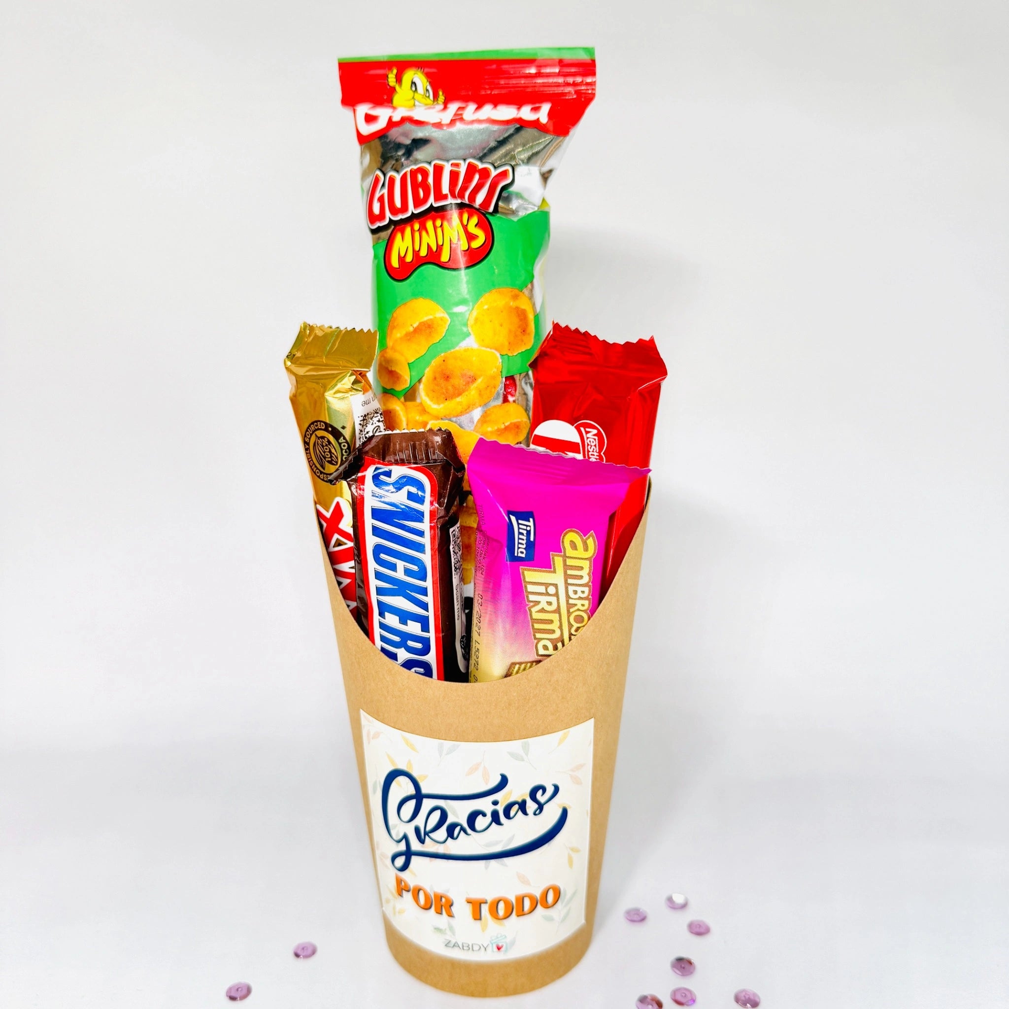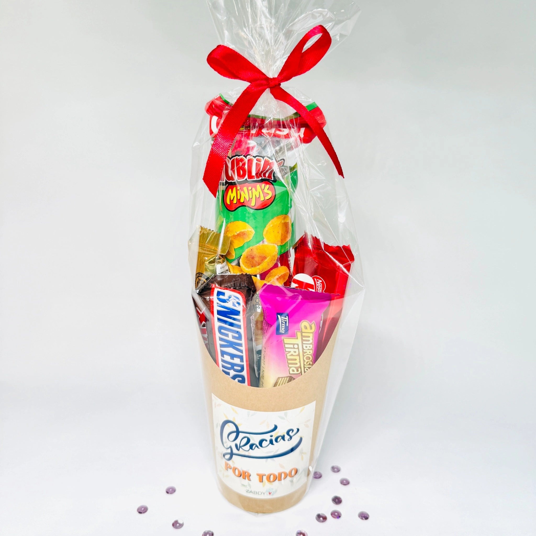 Un obsequio lleno de dulzura para decir “gracias” de una manera especial. Este vaso está lleno de deliciosas chocolatinas y snack, cuidadosamente presentados con un toque elegante y un lazo decorativo. Es el detalle perfecto para agradecer con cariño una amigaPorque a veces, las palabras más sencillas son las que...