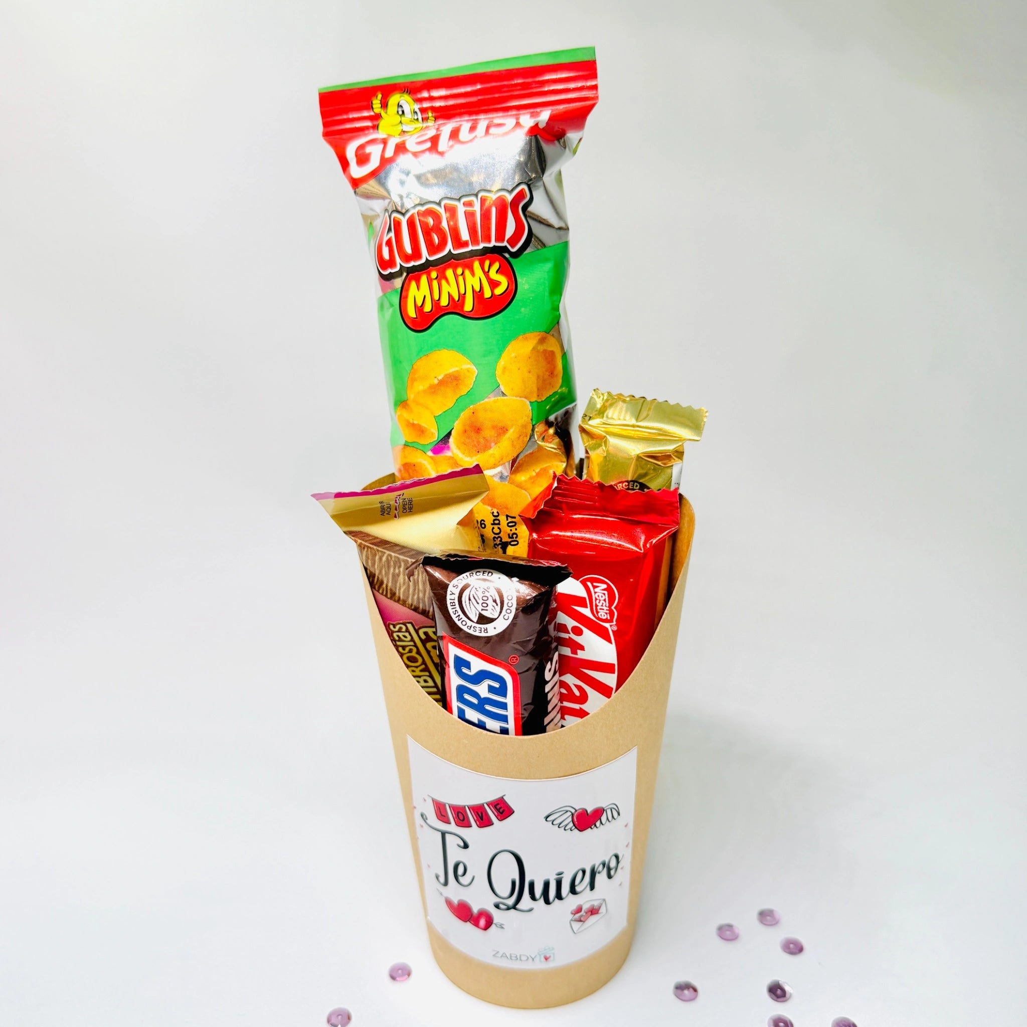Un detalle sencillo, dulce y lleno de cariño, ideal para cualquier ocasión especial. Este vaso está cuidadosamente decorado y repleto de deliciosas chocolatinas (pueden variar según disponibilidad), convirtiéndose en el regalo perfecto para expresar amor y gratitud. Ideal para sorprender a mamá, transmitiendo un mensaje claro y emotivo: “Te quiero”.