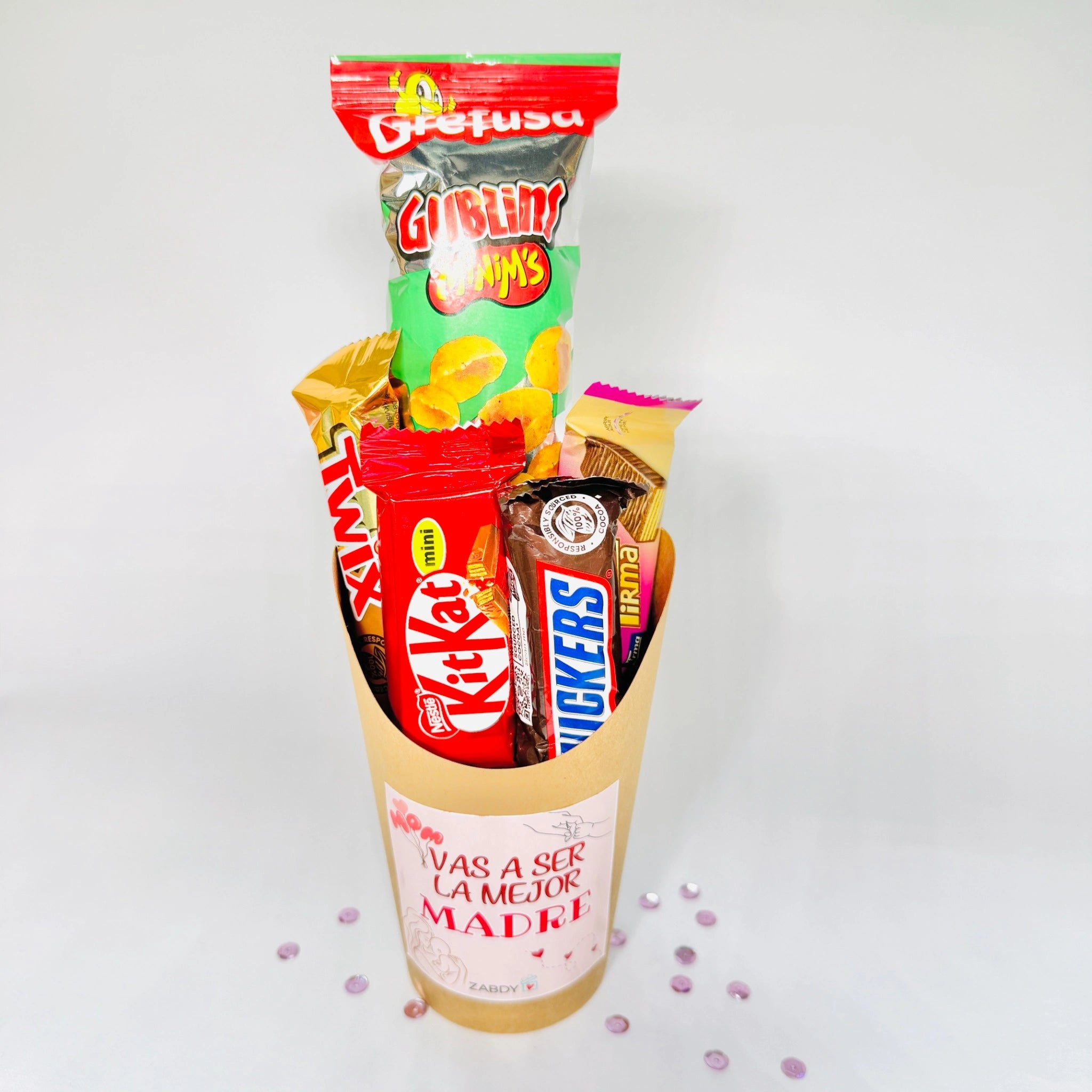 Un regalo cargado de dulzura para celebrar una etapa mágica. Este vaso lleno de chocolatinas es ideal para futuras mamás, un detalle perfecto para acompañar una noticia especial o un momento de espera lleno de amor. Su diseño delicado y su mensaje lleno de ternura hacen de él un presente único, pensado para emocionar y endulzar corazones. Los chocolates pueden variar según la disponibilidad.