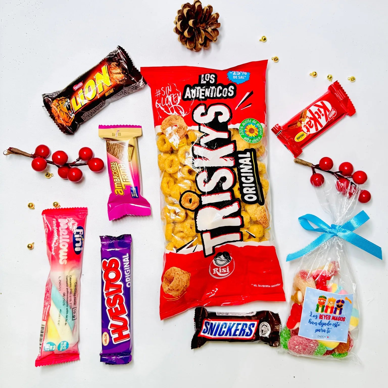Incluye una combinación de productos como nubes, chocolatinas, snacks salados, mini dulces y una bolsita especial tematizada de Reyes, todo presentado de manera elegante y listo para entregar. Perfecto para regalar en colegios, empresas, familias, eventos o simplemente como un detalle emocional que dice: “Los Reyes Magos también pensaron en ti”.