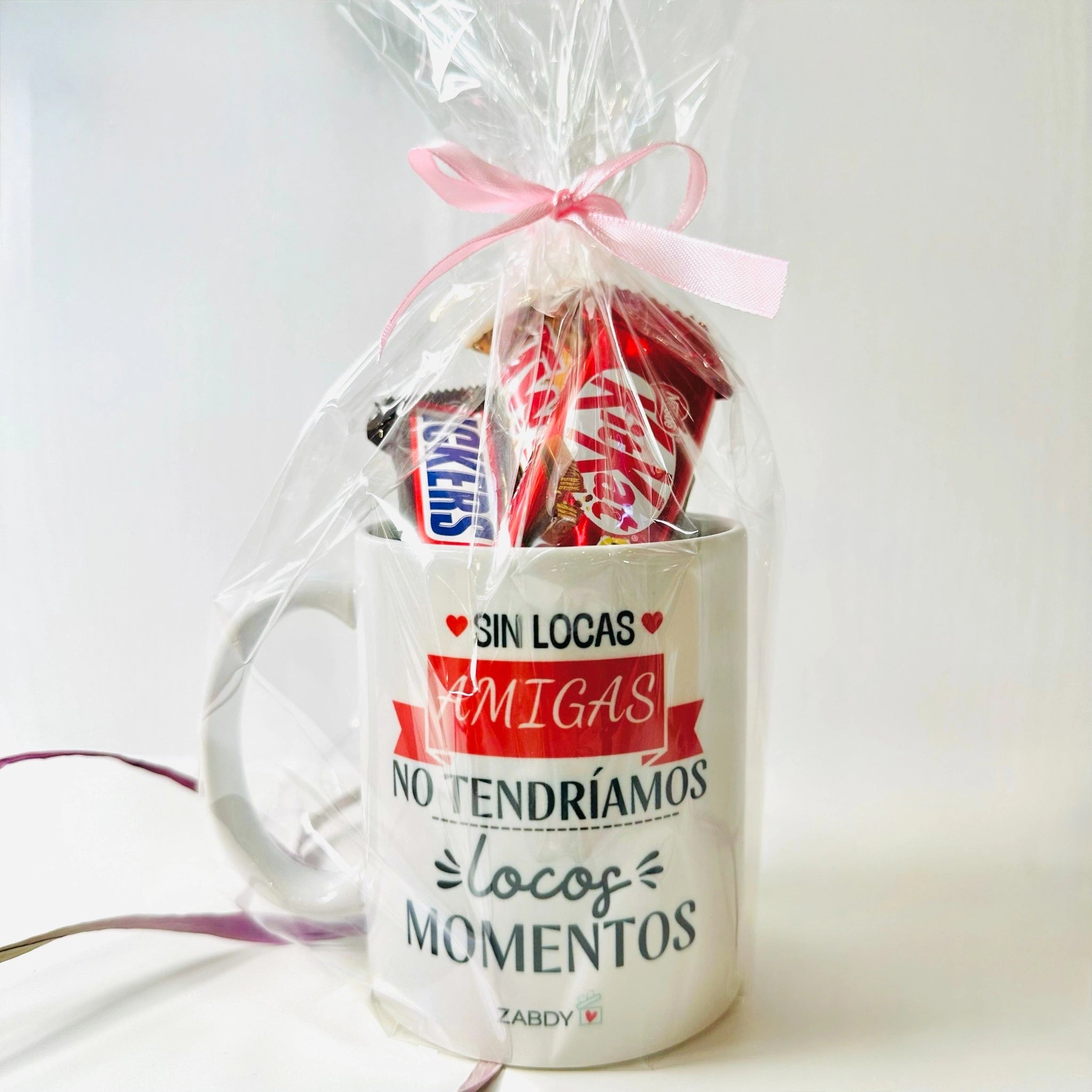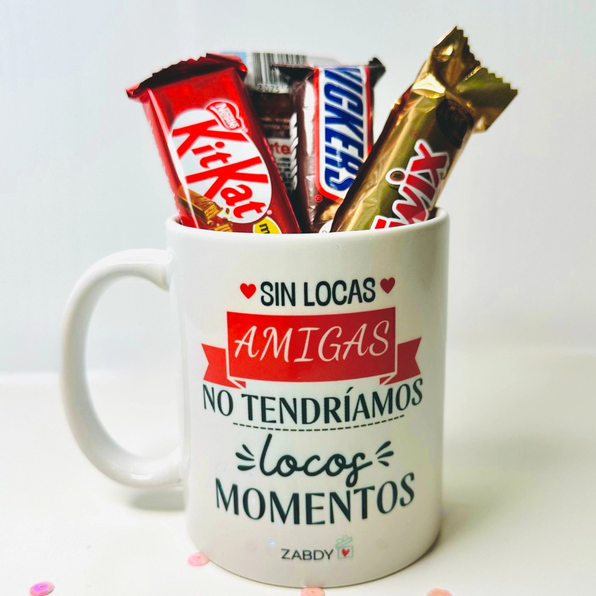 Taza Con Chocolates “Sin Locas Amigas No Tendríamos Locos Momentos”