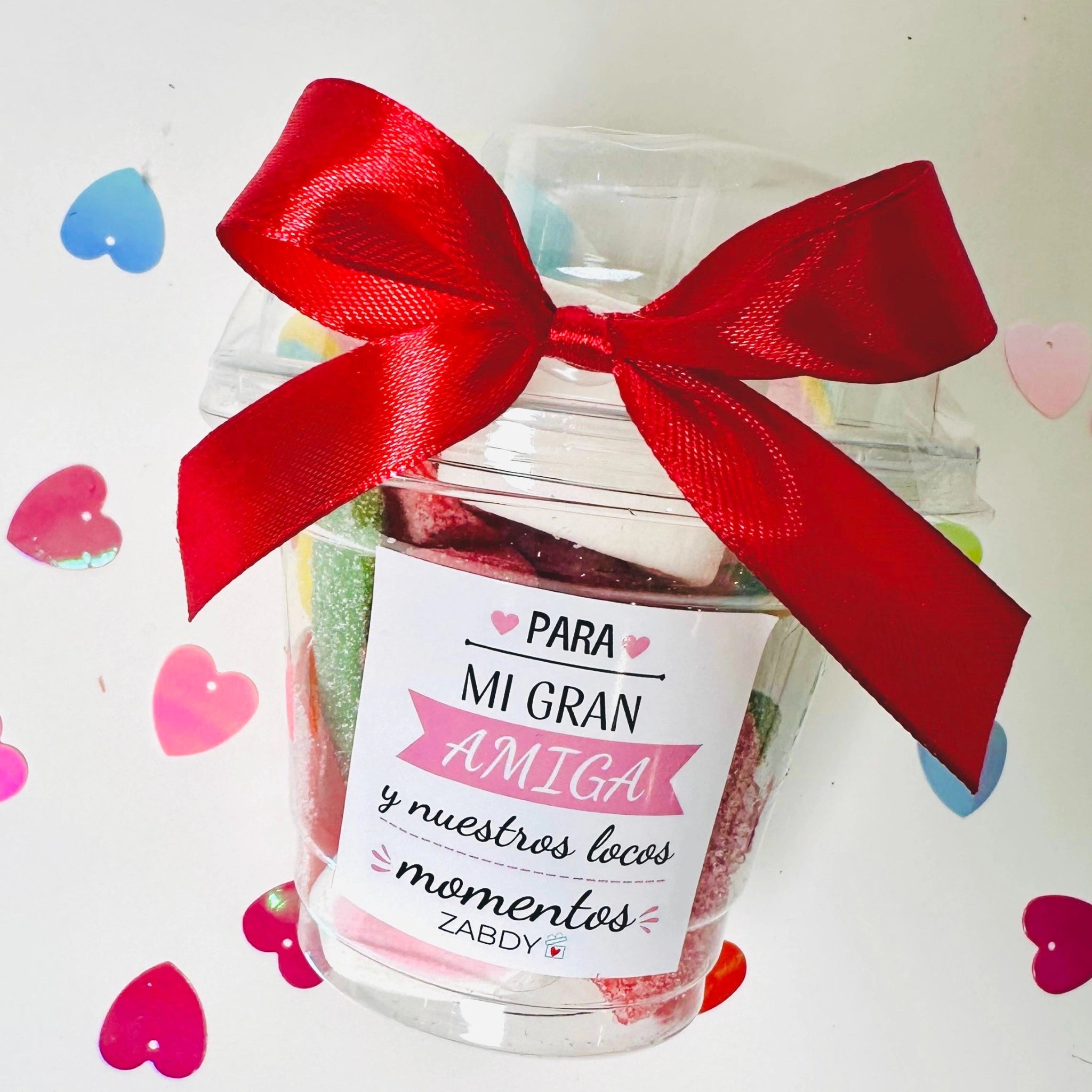 Descripción SEO:Vaso pequeño de gominolas “Para mi gran amiga y nuestros locos momentos”, un regalo original y divertido para esa amiga que siempre te acompaña en cada aventura. Repleto de gominolas suaves y dulces, presentado con un lazo y un mensaje que transmite cariño y complicidad. Ideal para sorprender en...